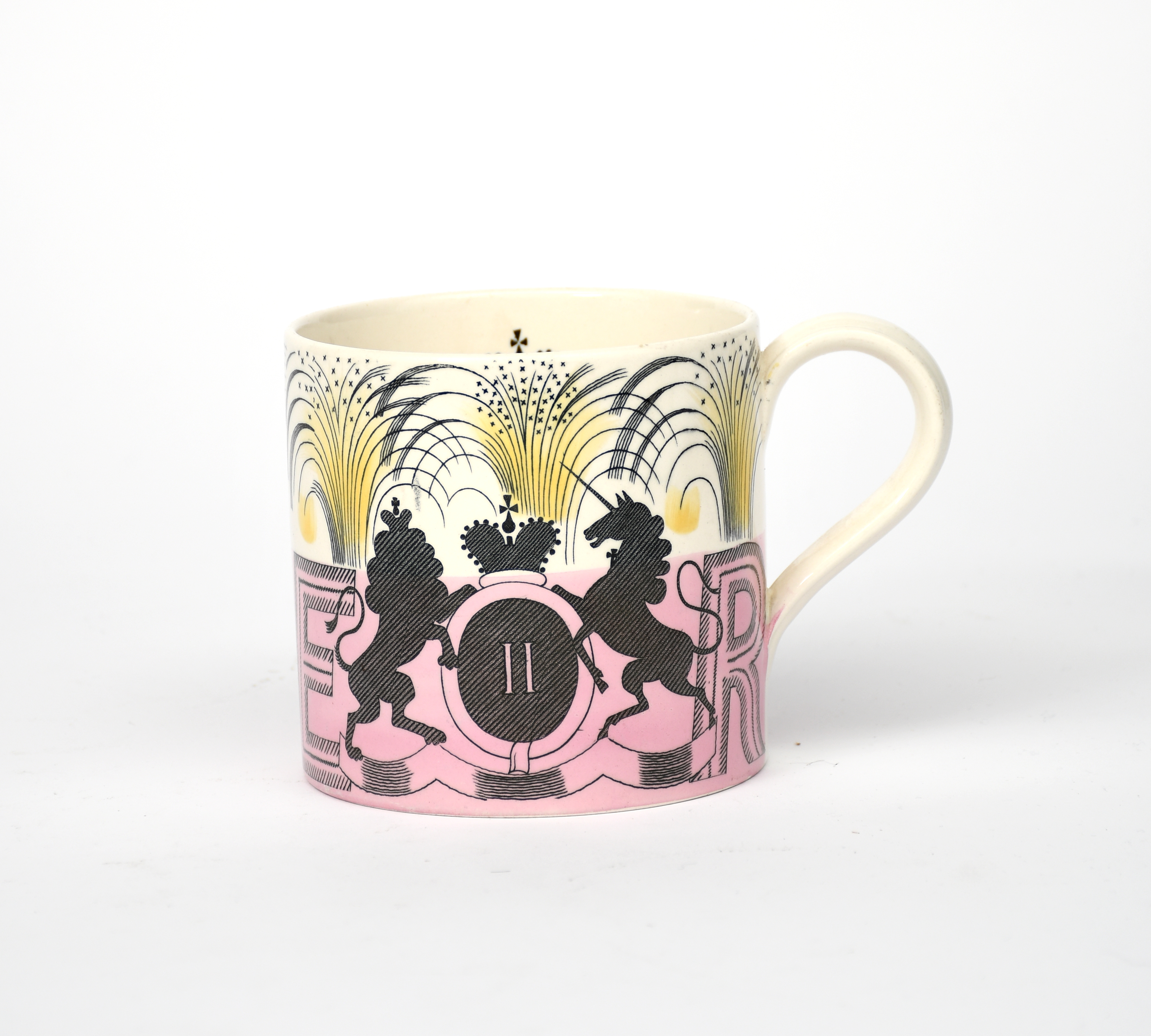 A Wedgwood Pottery 'Coronation of Her Majesty Queen Elizabeth II' mug after the original design by Eric Ravilious, 1953, printed with heraldic design below stylised fireworks, printed factory marks, 10.2cm. high