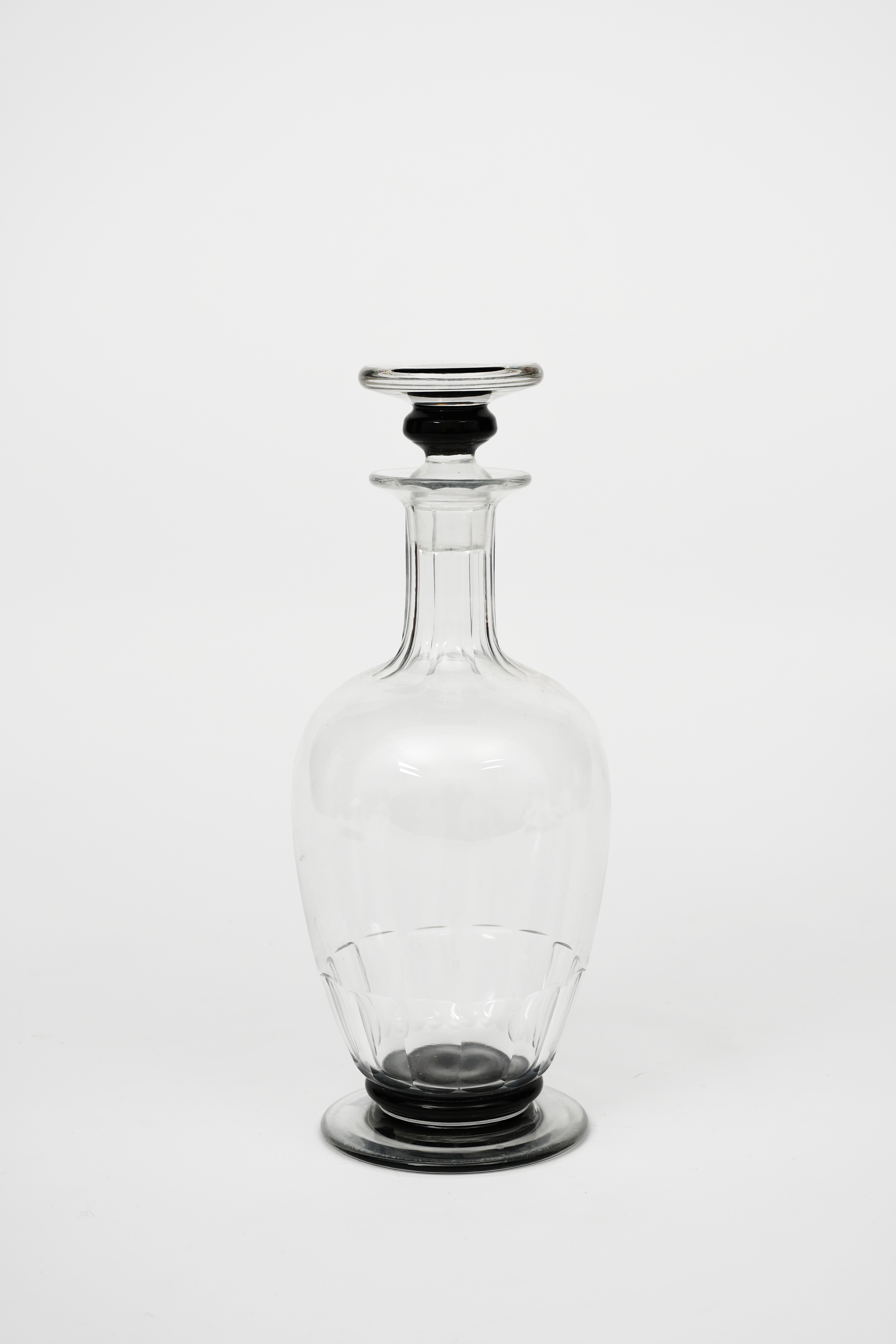 A Stevens & Williams glass decanter and stopper designed by Keith Murray, footed form, the decanter with flat cut bands to base and neck, and a black glass band to foot, the flat disc stopper with black glass band, apparently unsigned, 26cm. high (2)