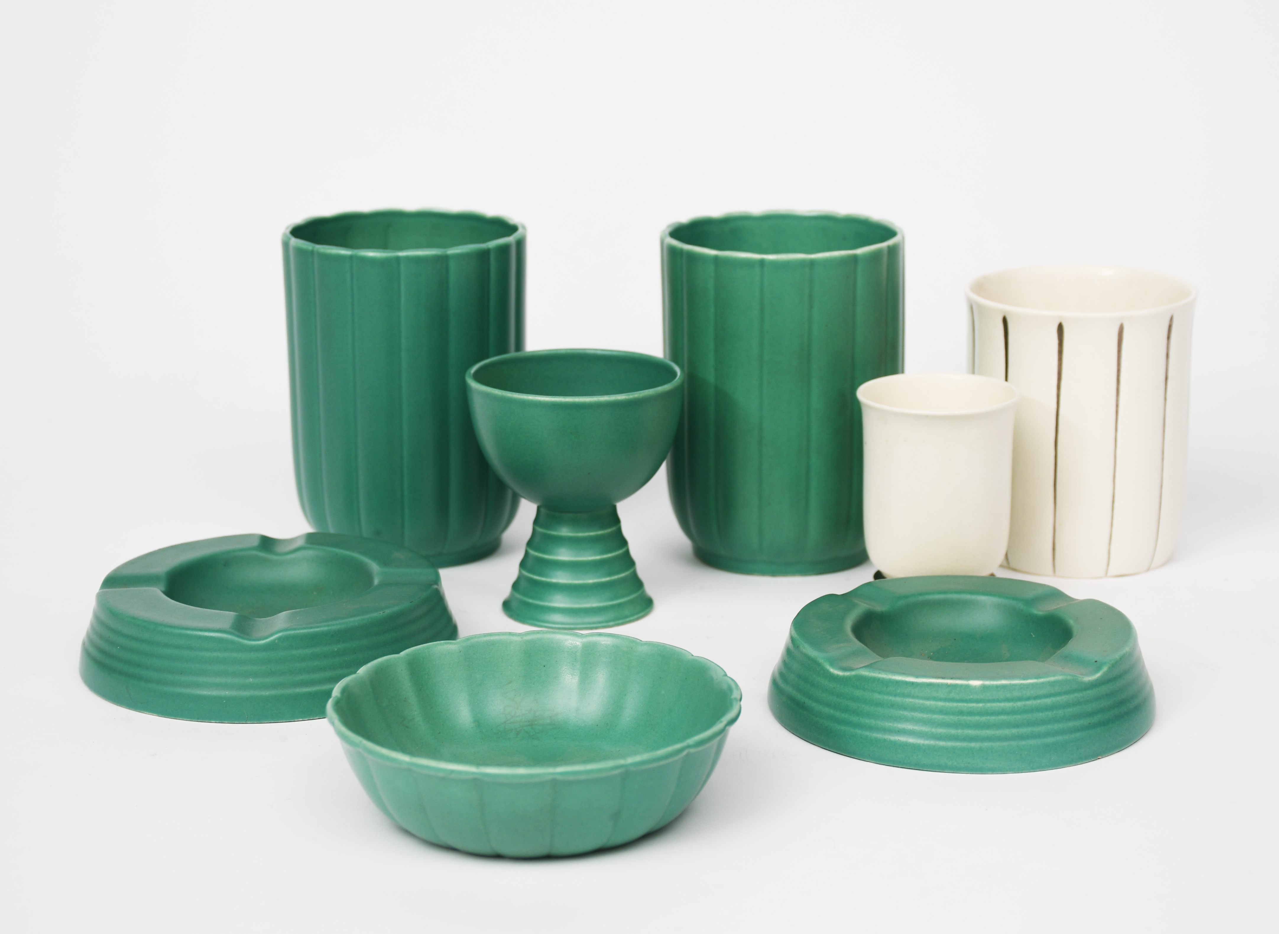 A pair of Wedgwood Pottery beaker vases designed by Keith Murray, fluted form, glazed matt green, another similar glazed white with silver lines, a smaller beaker, a goblet, dish and two ashtrays, printed factory marks, KM monogram, 11cm. high (8)