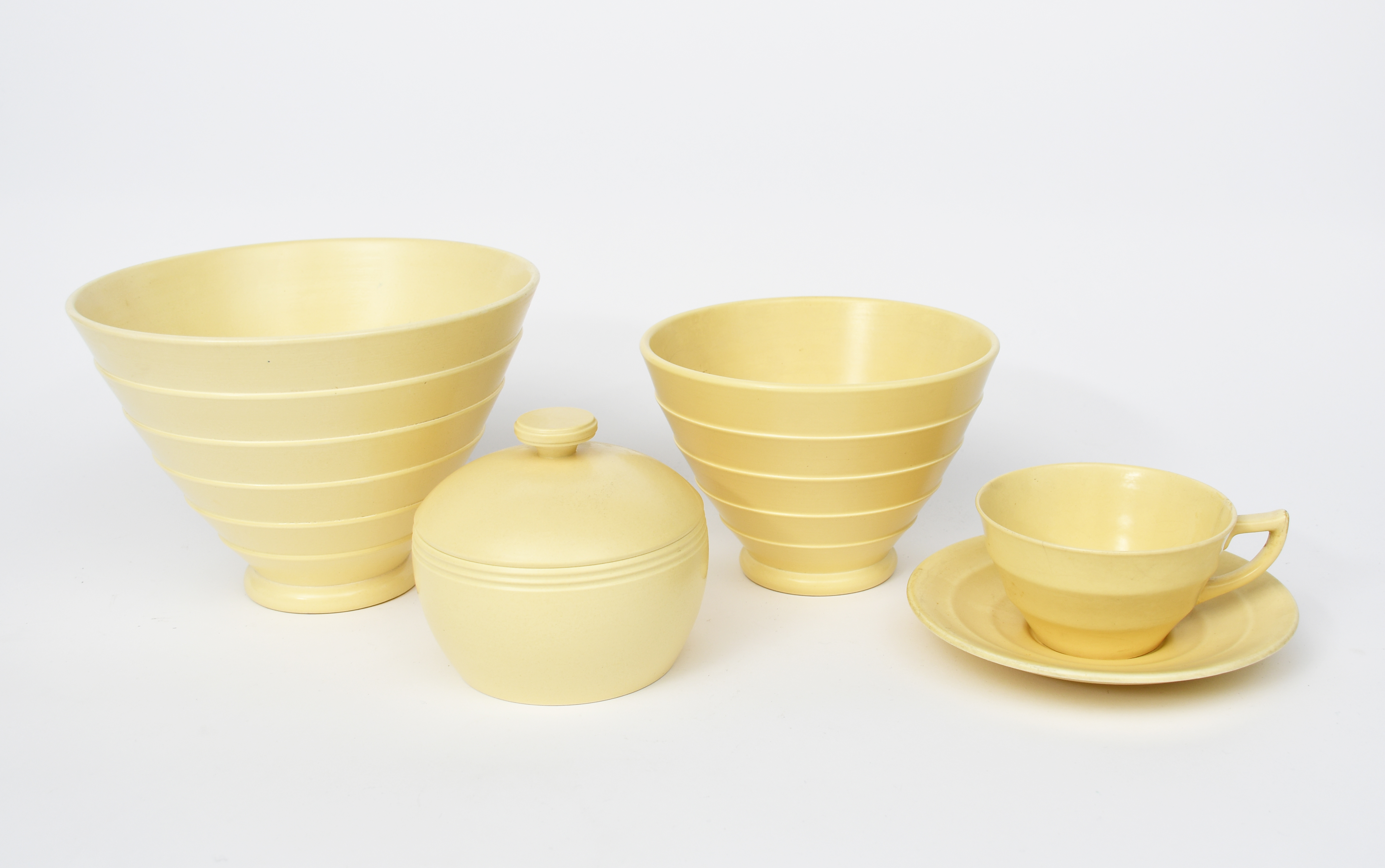 A Wedgwood Pottery bowl designed by Keith Murray, shape no. 3753, footed, flaring form, covered in a matt straw glaze, another Wedgwood Pottery larger bowl, a powder bowl and cover and a tea cup and saucer designed by Keith Murray, printed factory marks, larger bowl restored 10.5cm. high (smaller bowl), (6)