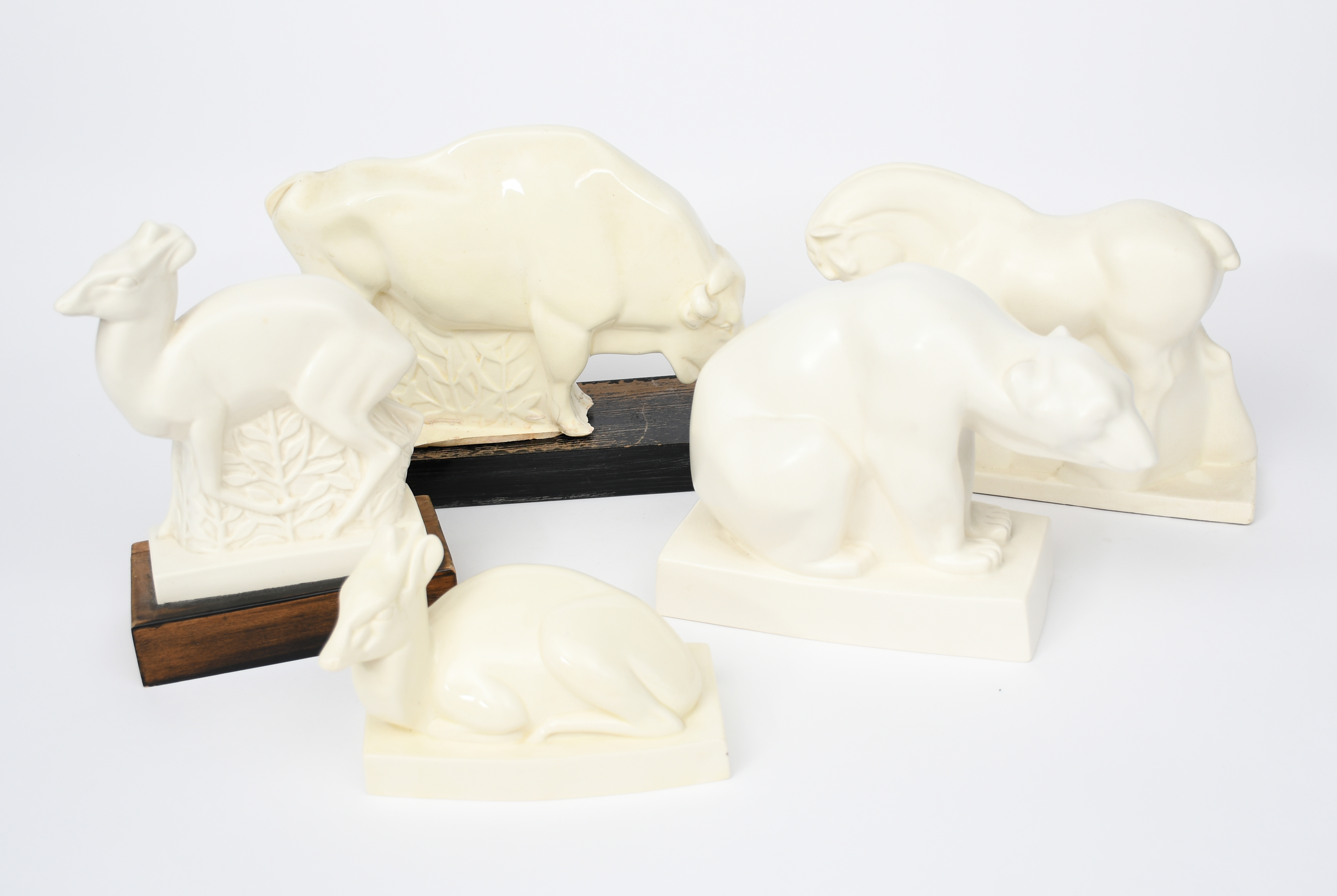 'Polar Bear' a Wedgwood Pottery figure designed by John Skeaping, covered in a matt white glaze, another Wedgwood 'Duiker Standing', and 'Duiker Lying' figures, a 'Bison' figure all designed by John Skeaping and glazed matt white, and a Wedgewood figure of a standing shire horse, printed and impressed marks, Bison figure damaged, 25cm. wide (polar bear), (5)