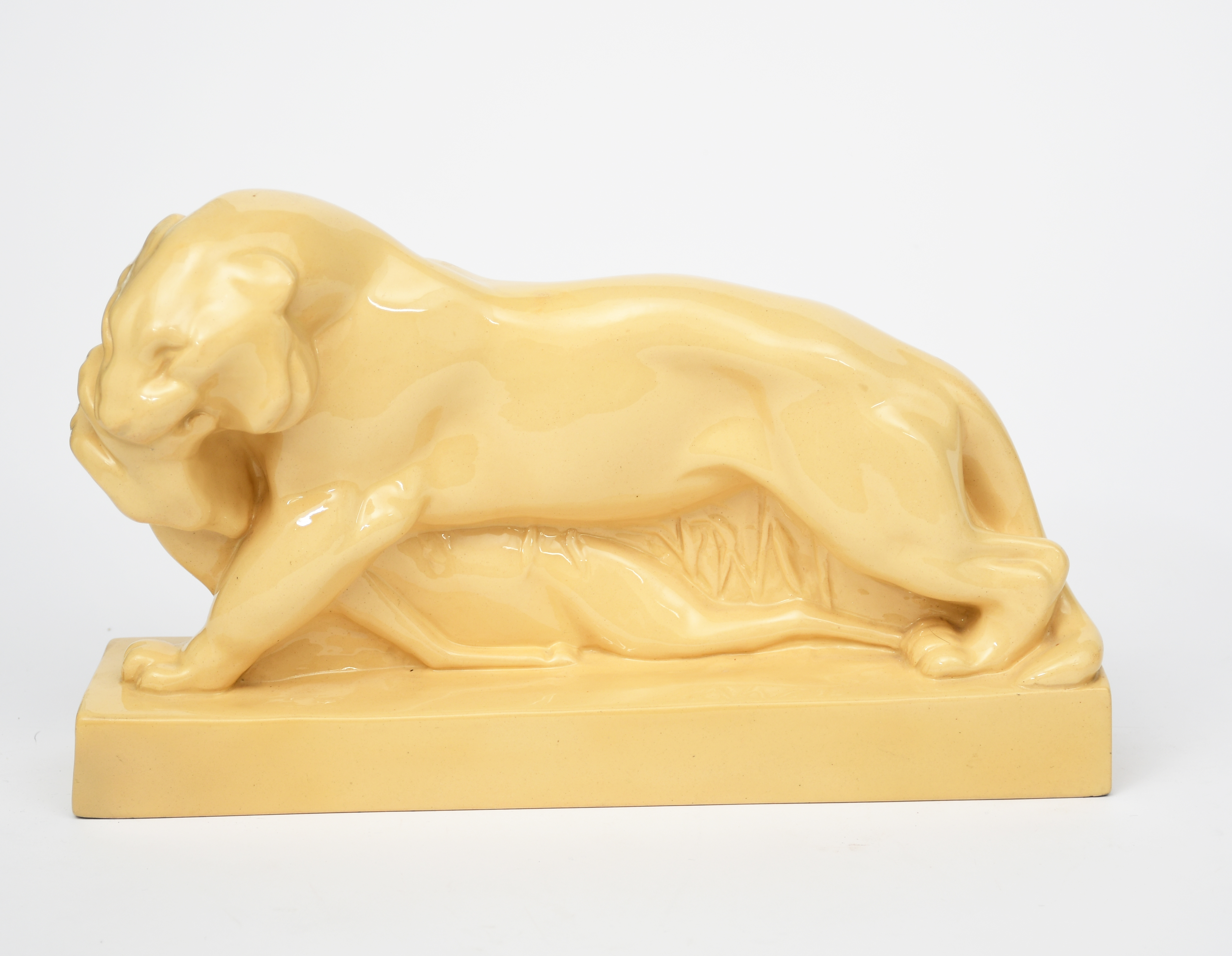 'Tiger and Buck' a Wedgwood Pottery figure designed by John Skeaping, glazed straw yellow, impressed factory marks, restored base, 33.5cm. wide