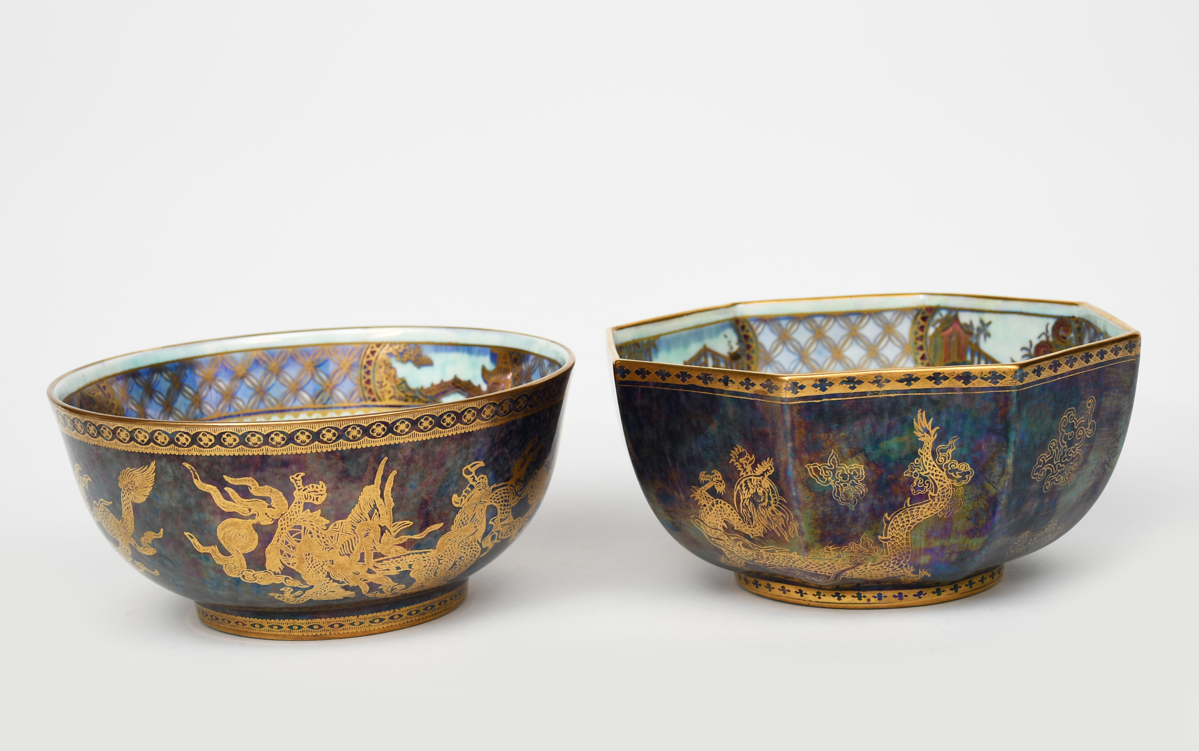 A Wedgwood Pottery Dragon lustre Octagon bowl designed by Daisy Makeig-Jones, pattern no. Z4831, printed with Chinese dragons in gilt on a dark green ground, the interior with a roundel of fruit in colours and gilt on a pearl lustre ground, and another Wedgwood Pottery Dragon lustre bowl printed and painted factory marks, 15.8cm. diam. (2)