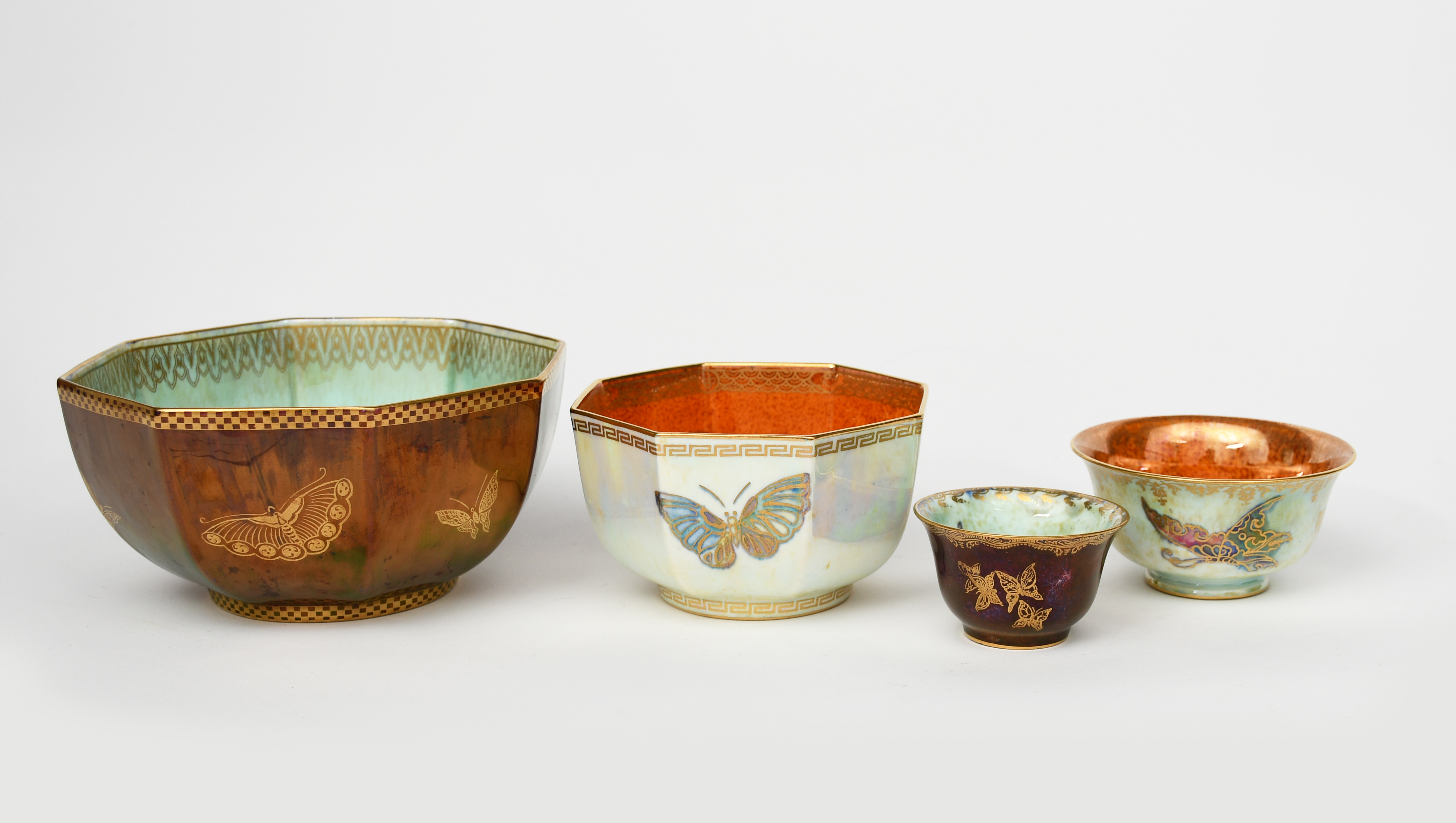 A Wedgwood Pottery Butterfly lustre bowl designed by Daisy Makeig-Jones, pattern Z.4827, octagonal form, printed with butterflies to the exterior in gilt on a mottled red lustre ground, the interior with butterflies in colours and gilt on a pearl lustre ground, a smaller octagonal Butterfly lustre bowl, and two smaller Butterfly lustre round bowls, printed and painted marks, 16.5cm. diam. (4)