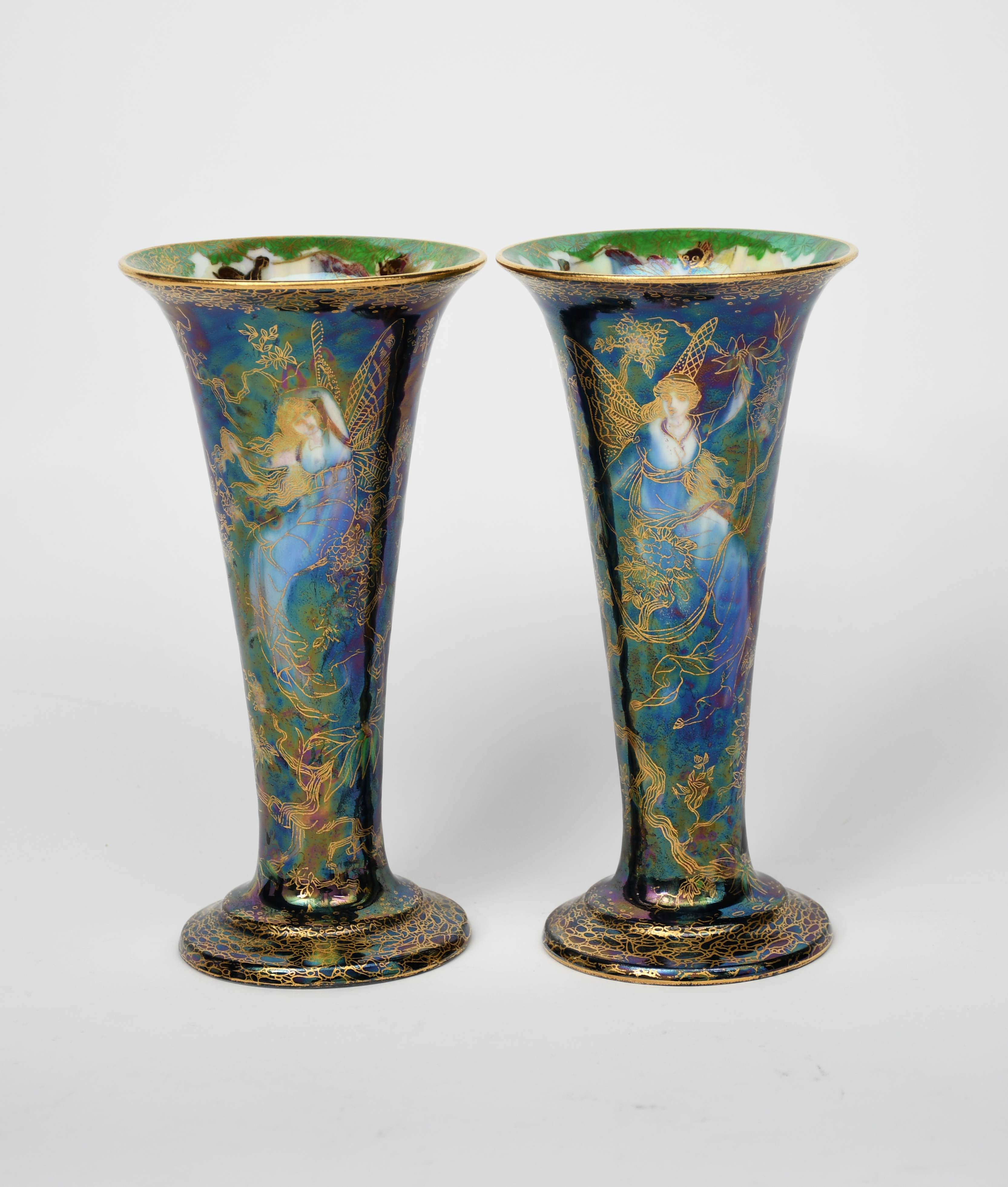 'Butterfly Woman' a pair of Wedgwood Pottery Fairyland lustre vases designed by Daisy Makeig-Jones, patten no.Z4968, printed and painted in colours and gilt on a black lustre ground, the interior pearl lustre printed and painted factory marks, 20cm. high (2)