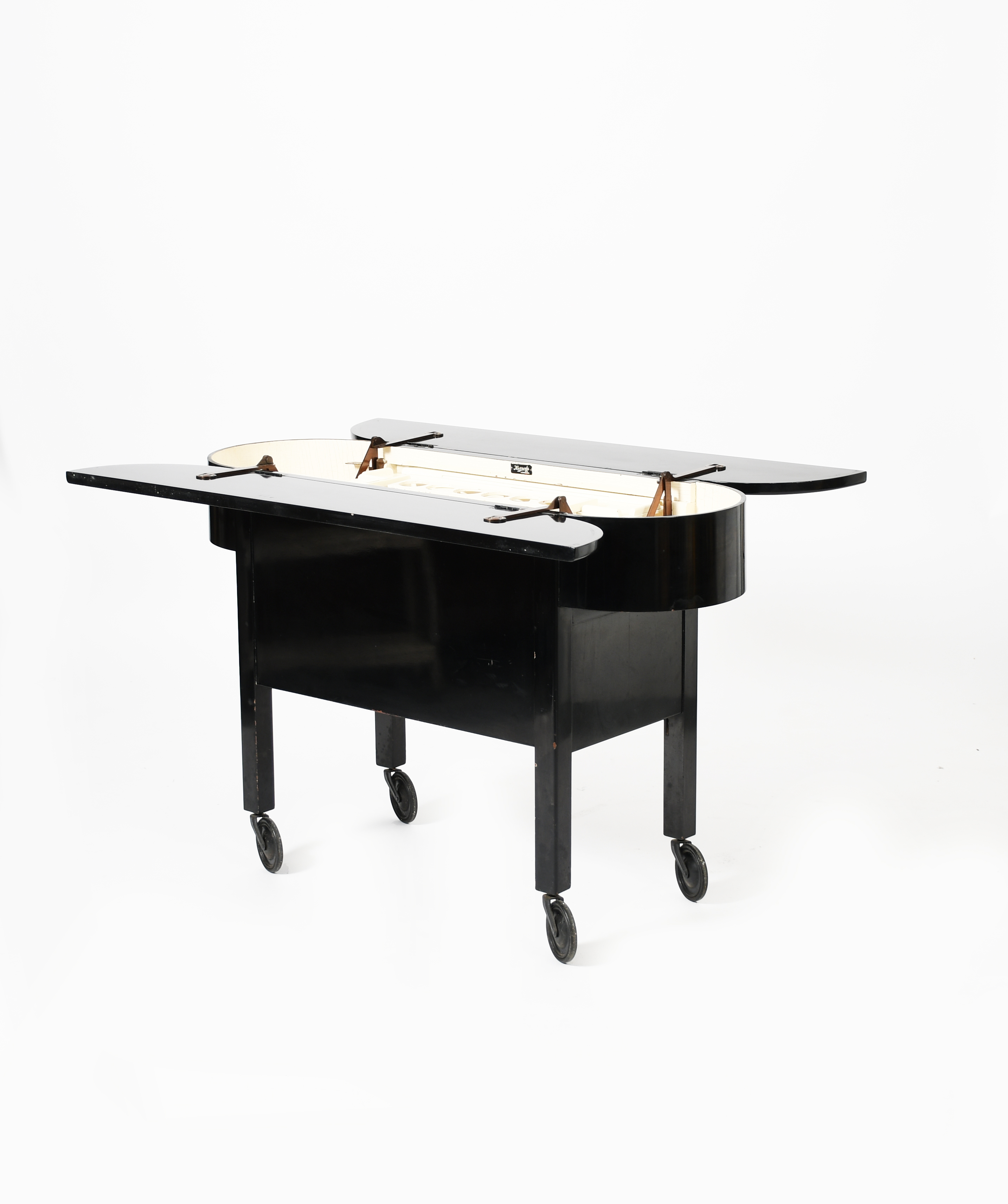 A Harrod's London ebonised wood cocktail drinks trolley, rectangular section, the top two hinged doors which open and raise a fitted compartment, painted white, on castors, applied label 77cm. high, 42cm wide.