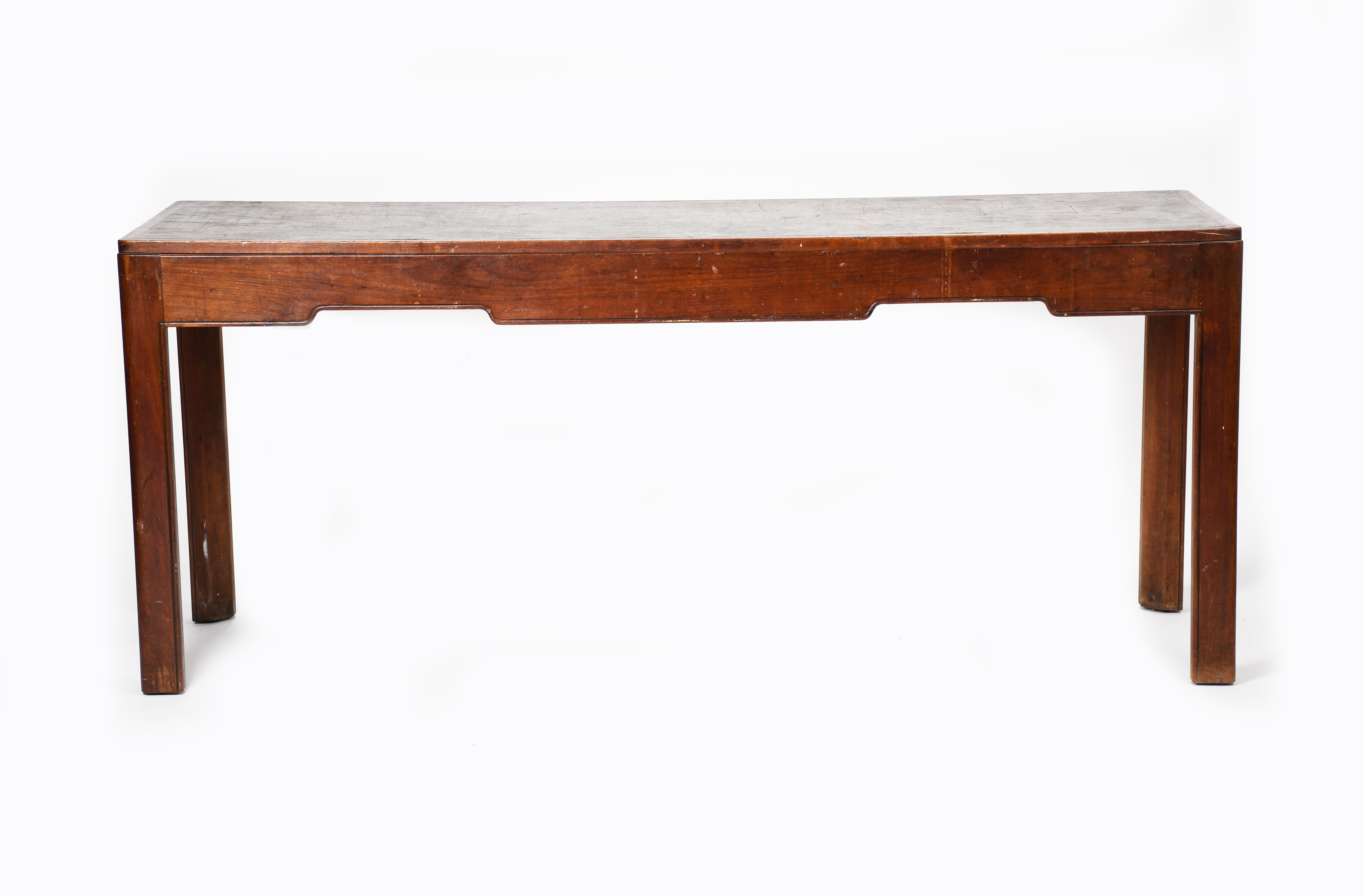 A pair of Rowley Gallery Anglo-Chinese oak tables, rectangular top with stepped under rail, on square legs, one with inset leather top, applied label,