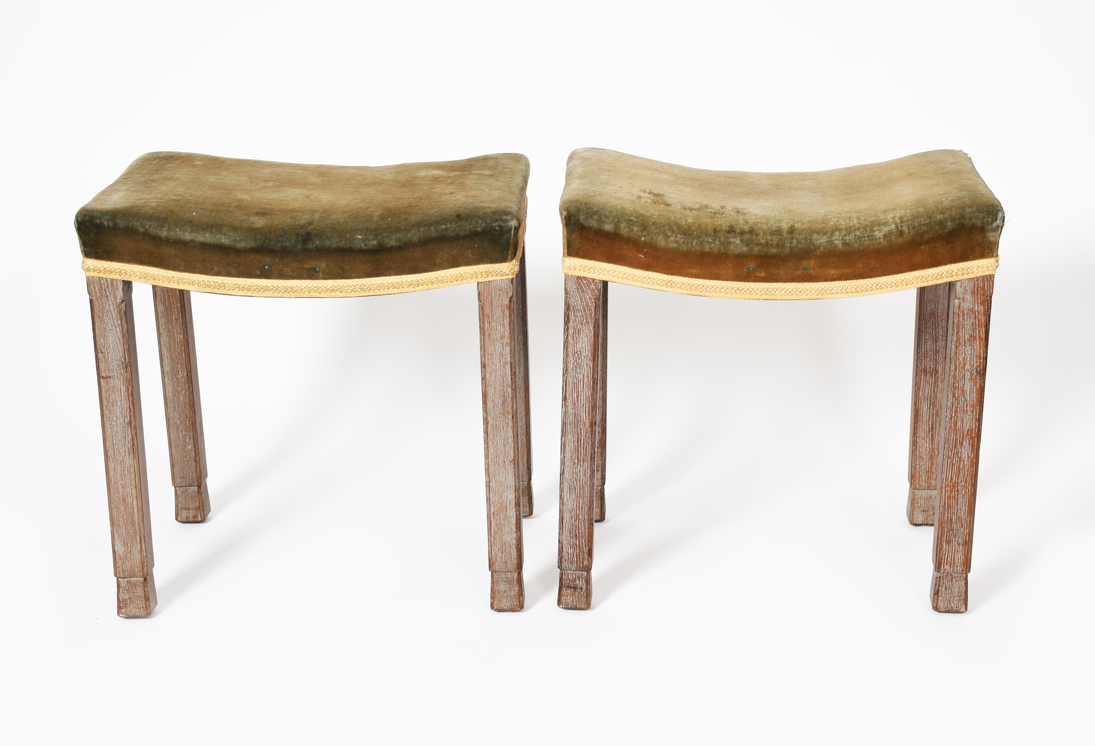 A pair of George VI Coronation stools, 1937, limed oak with blue velvet padded seat and gold braiding,