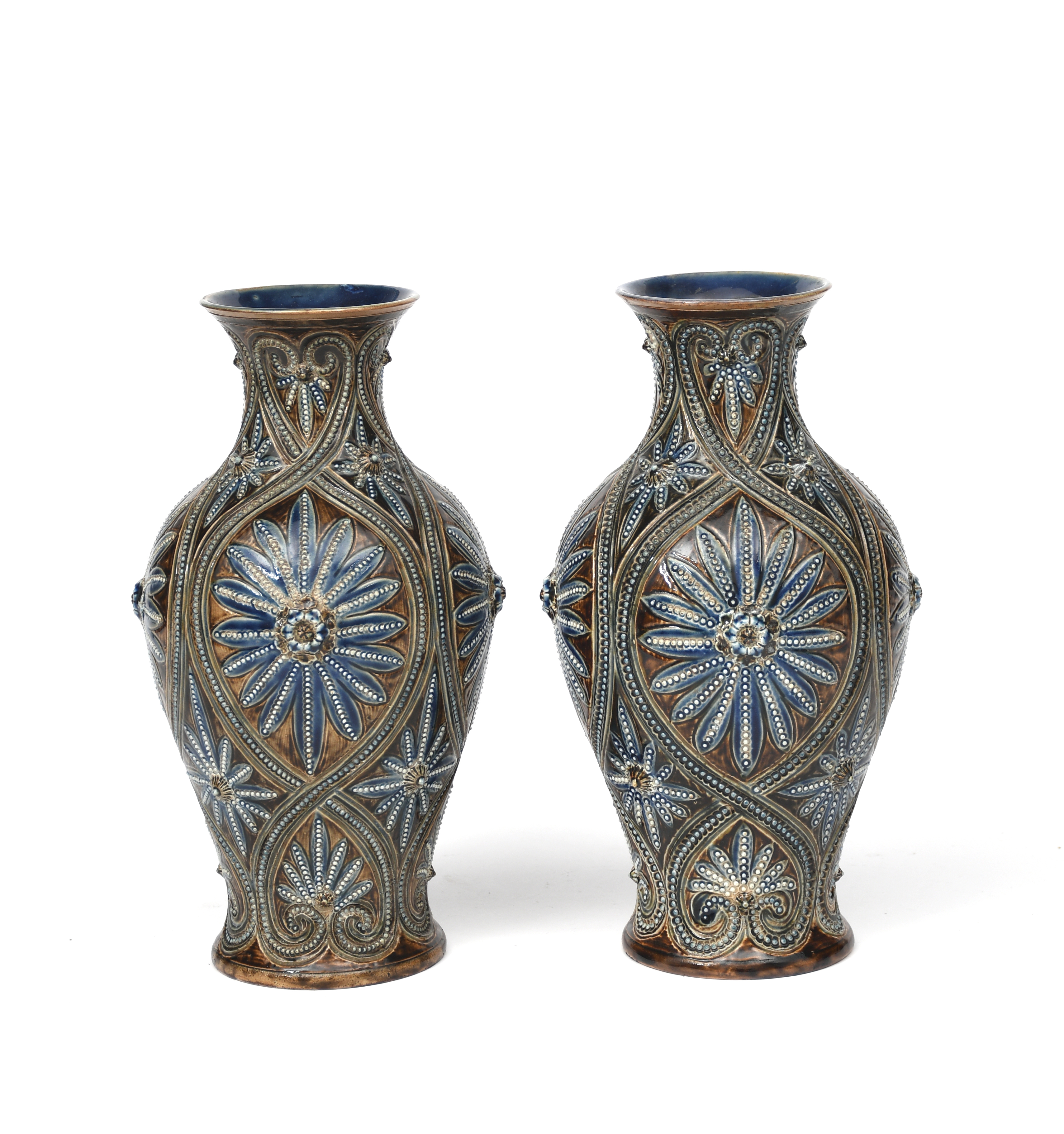 A pair of Doulton Lambeth stoneware vases by Frank Butler, shouldered form decorated with applied florets and beadwork forming panels in blue, white and ochre, impressed factory mark, incised monogram, restored top rim to one, 27.5cm. high (2)