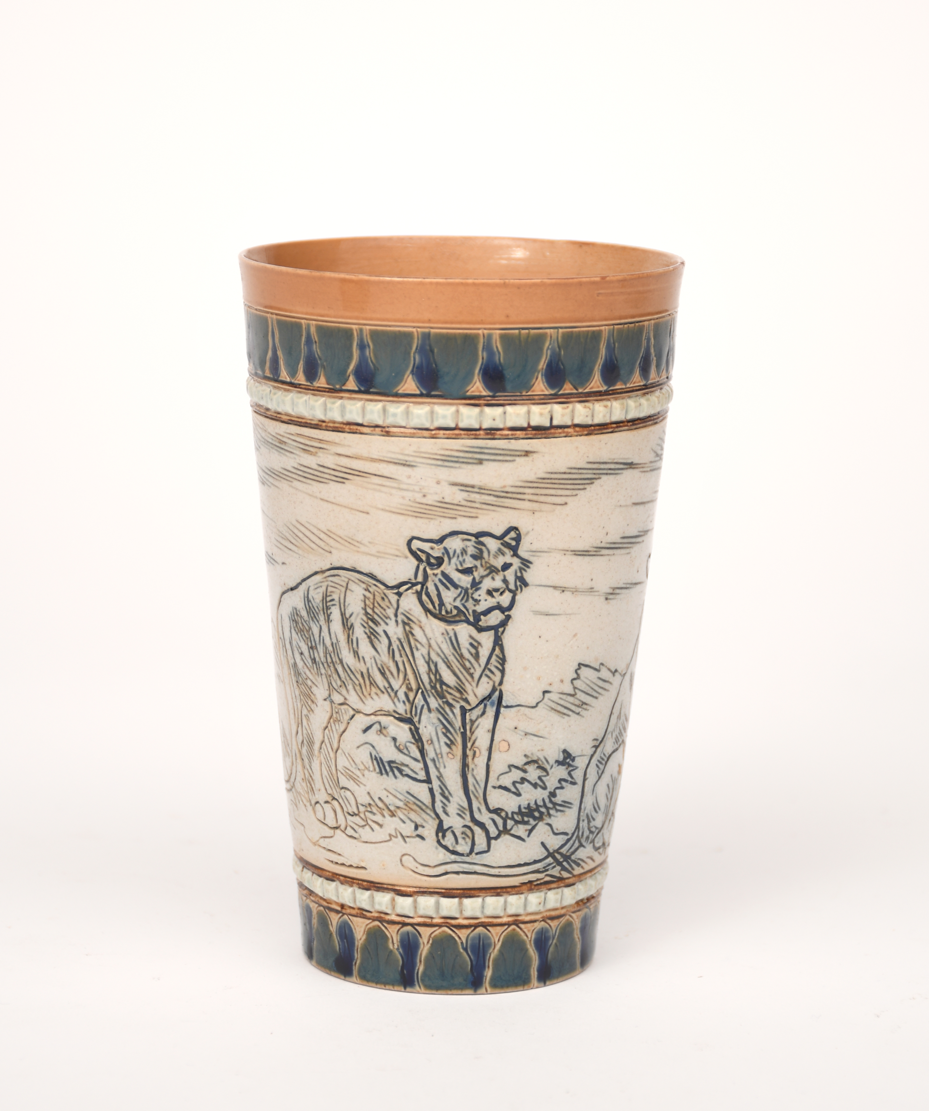 A Doulton Lambeth stoneware beaker by Hannah Barlow, dated 1883, flaring cylindrical form, incised with a Lioness and three cubs between borders in green and blue on a buff ground, impressed and incised marks, restored, 13.5cm. high