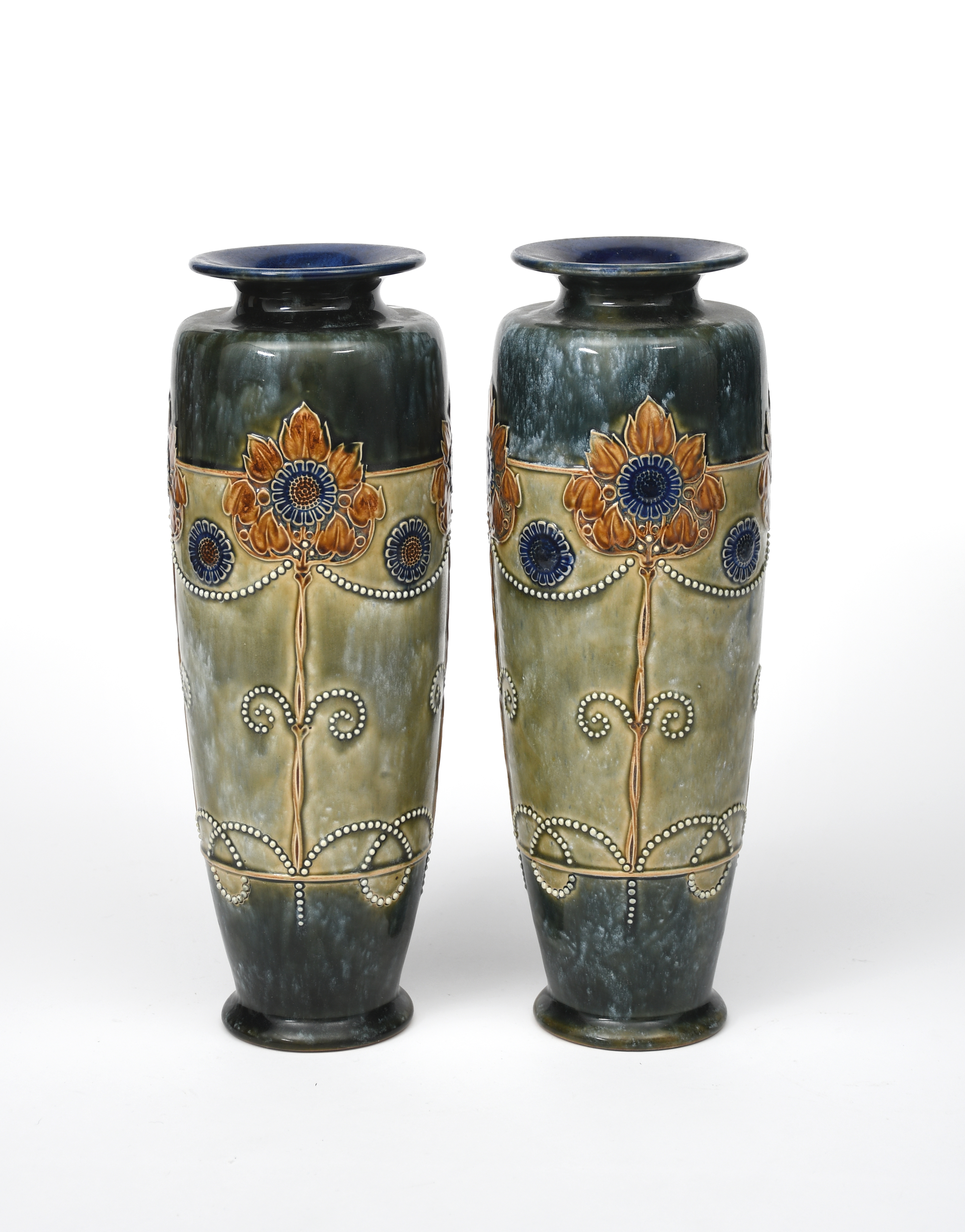 A pair of Art Nouveau Royal Doulton stoneware vases, shouldered form with flaring disc top rim, decorated in low relief with stylised flowers and foliage in shades of blue, green and ochre, with applied white beadwork, impressed factory marks, incised monograms, 36.5cm. high (2)