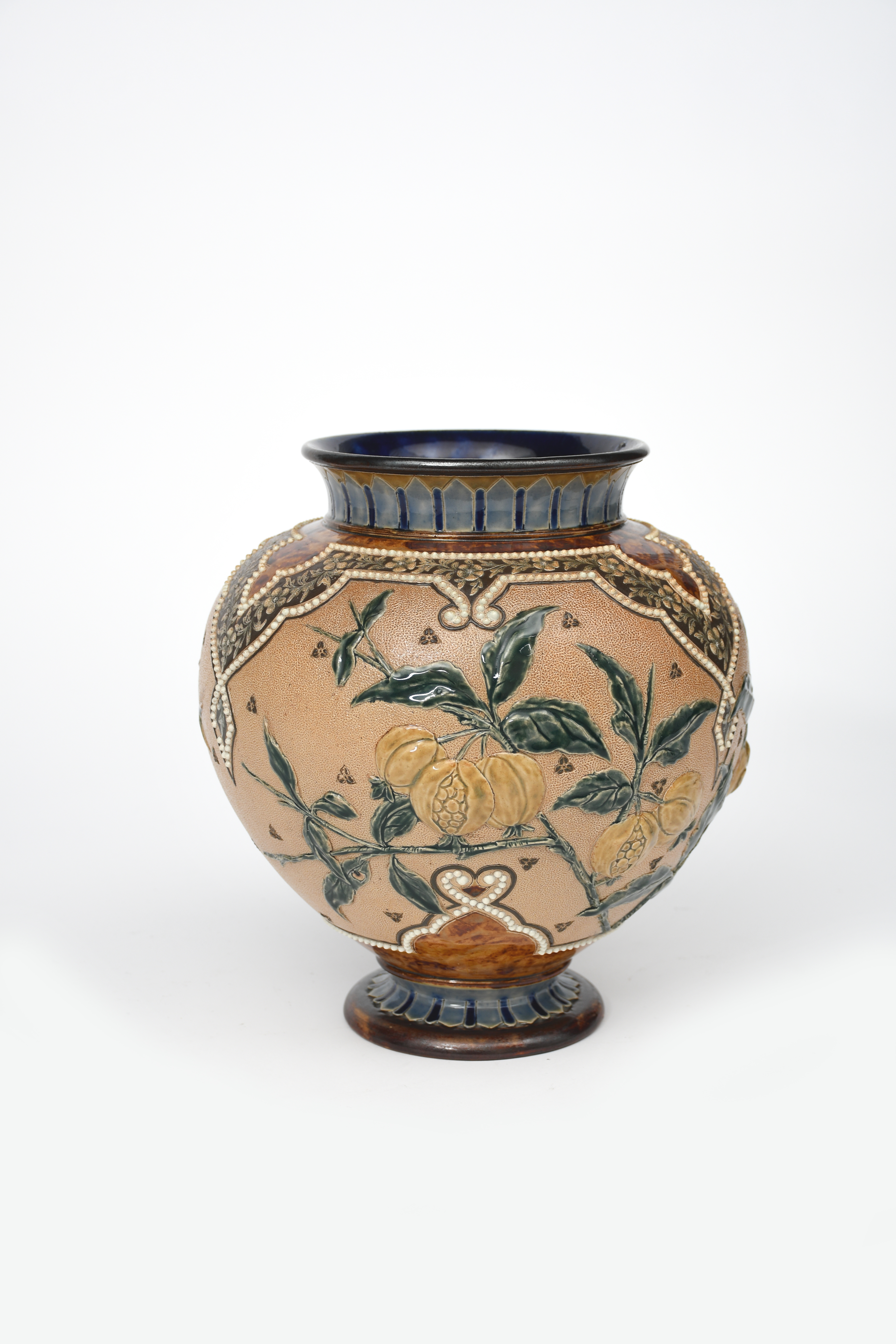 An Aesthetic Movement Doulton Lambeth stoneware vase by Eliza Simmance, dated 1887, incised and modelled with panels of splitting pomegranate fruit, in green and sand on a textured buff ground, with applied white beadwork borders and thin band of painted flowers to shoulder, impressed factory mark, 1887, incised monogram, 25.5cm high