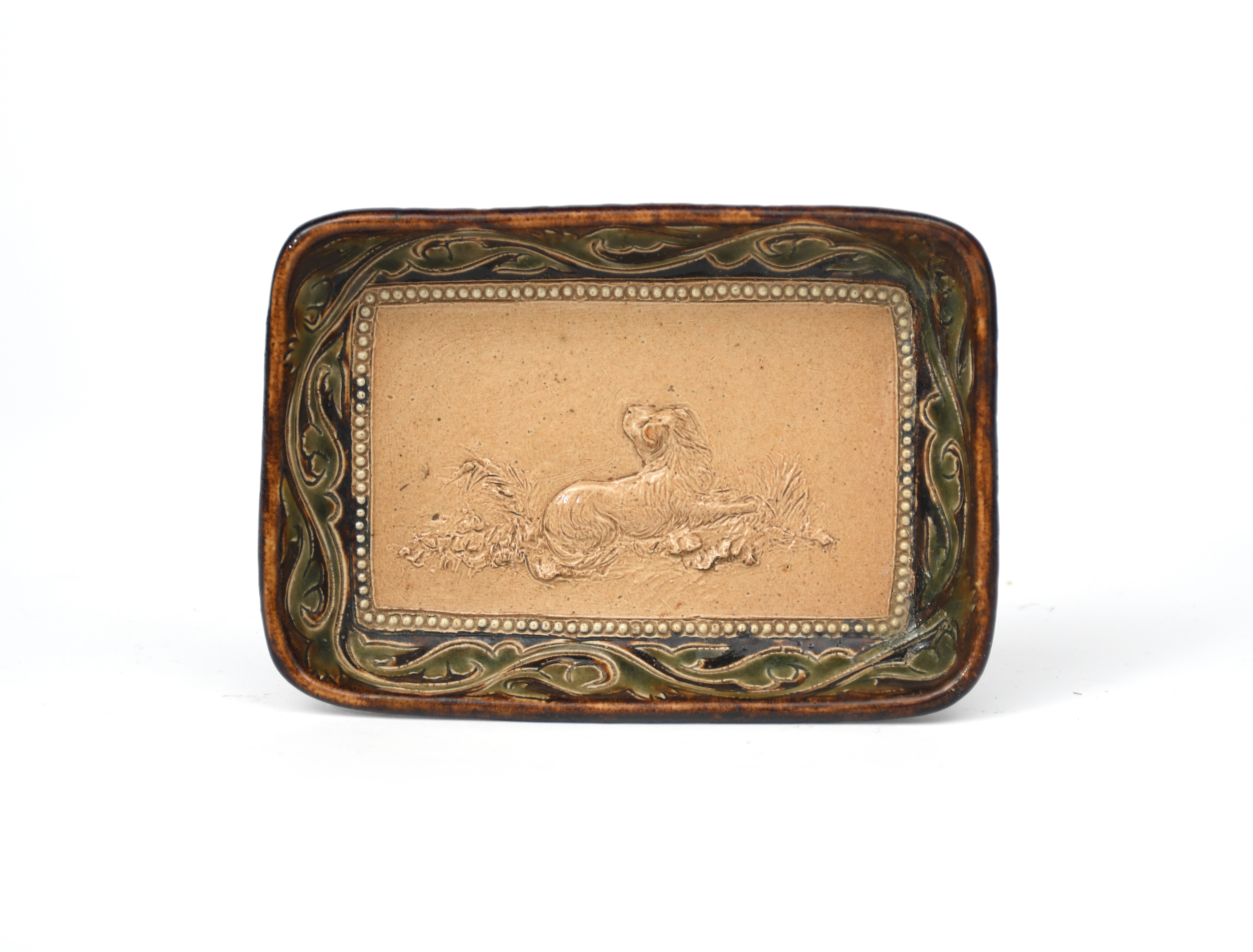 An unusual Doulton Lambeth stoneware dish attributed to Hannah Barlow, rectangular, cast in low relief with an alert dog, the rim with incised scrolling foliage border, in shades of green and brown on a buff ground, impressed factory mark and date, incised monograms for Mary Ann Thomson and GB, restored, 13cm. wide