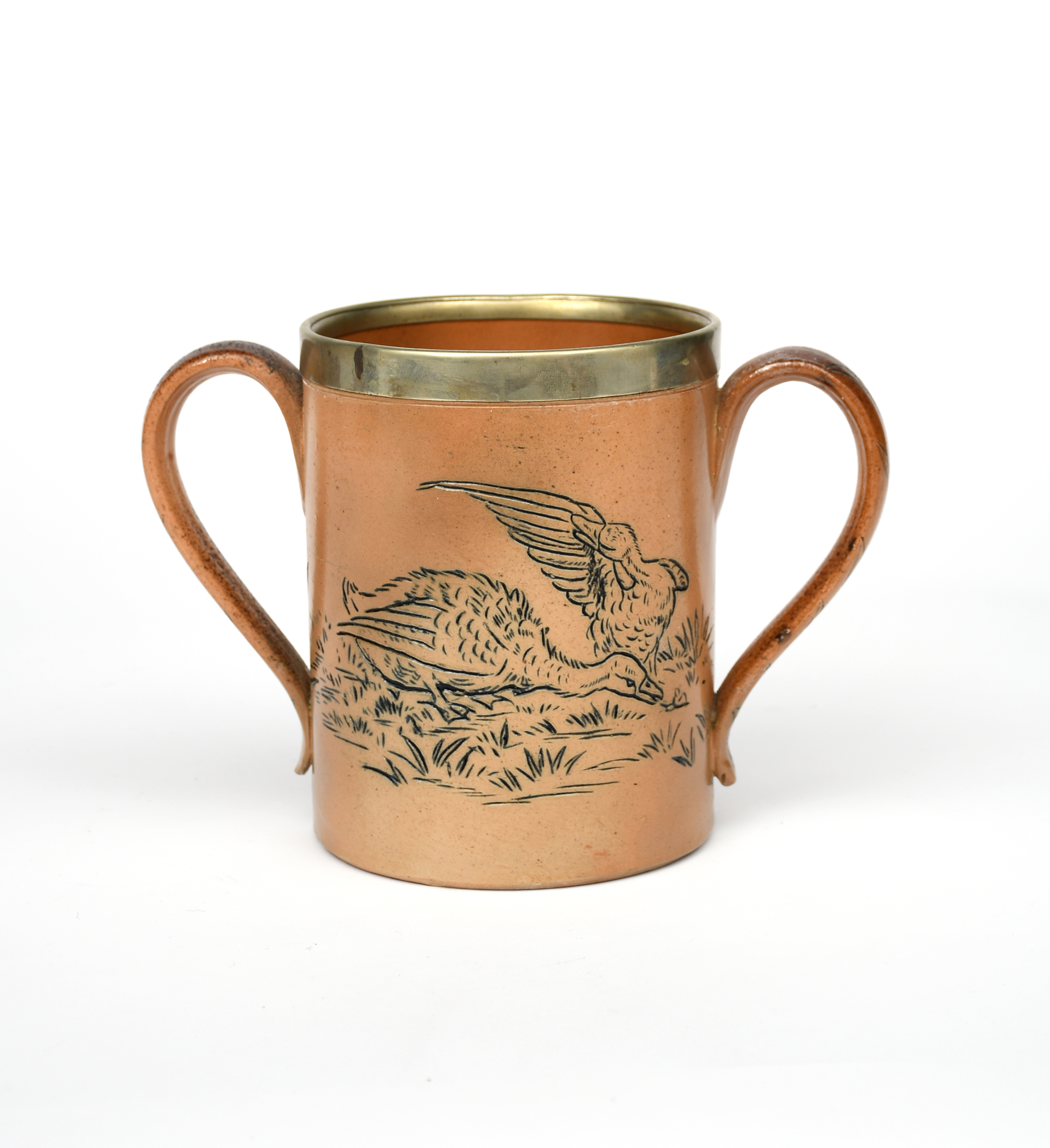A Doulton Lambeth stoneware twin-handled cup by Hannah Barlow, cylindrical form with applied handles, incised with ducks on a riverbank, in black on a buff ground, with metal rim, impressed factory mark, incised monogram, restored, 18.5cm. high