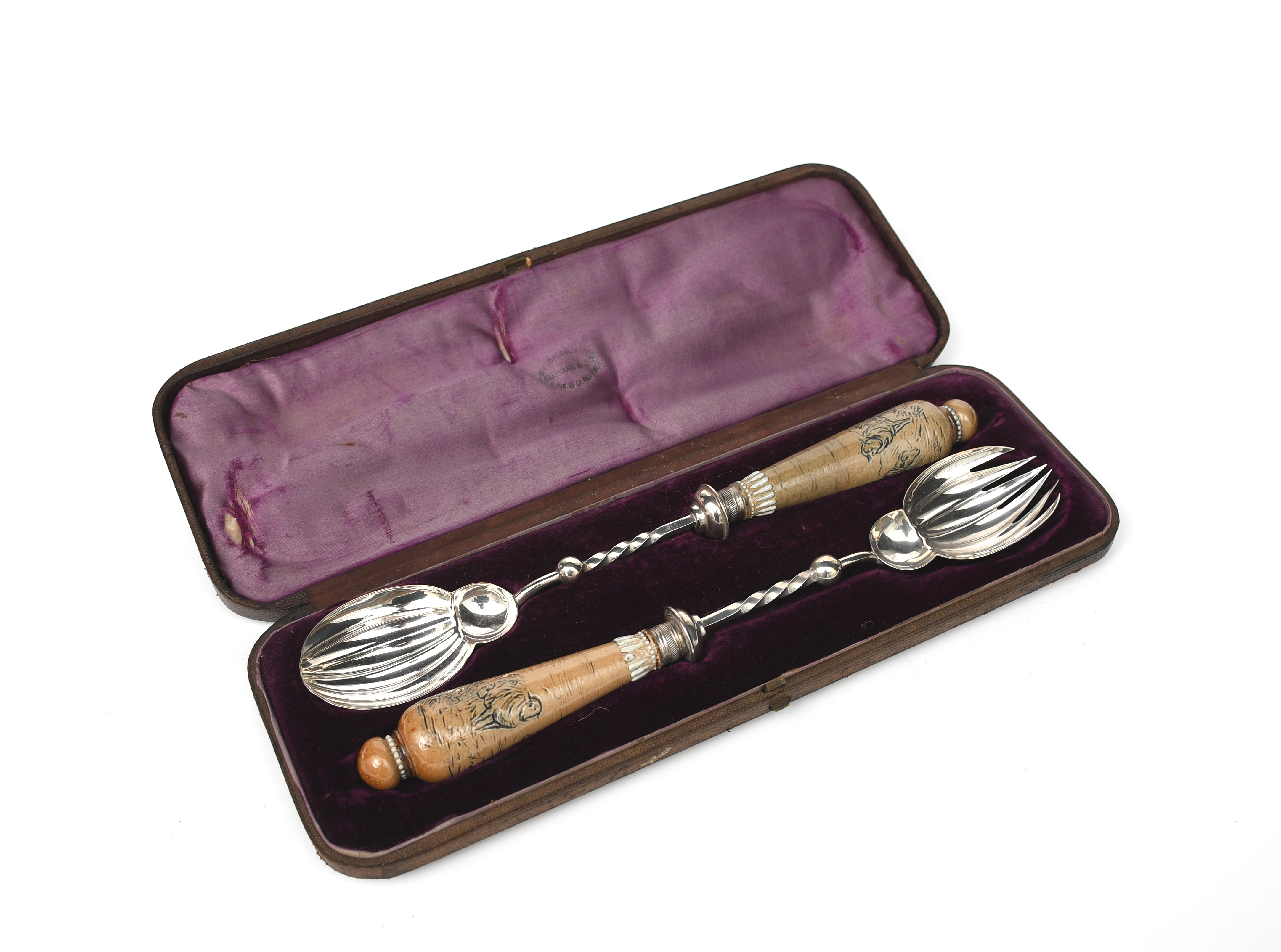 A pair of Doulton Lambeth stoneware servers by Hannah Barlow, the stoneware handles incised with sheep grazing and resting. with electroplated bowls, in fitted silk lined case, incised HB monograms, 27cm. long (2)