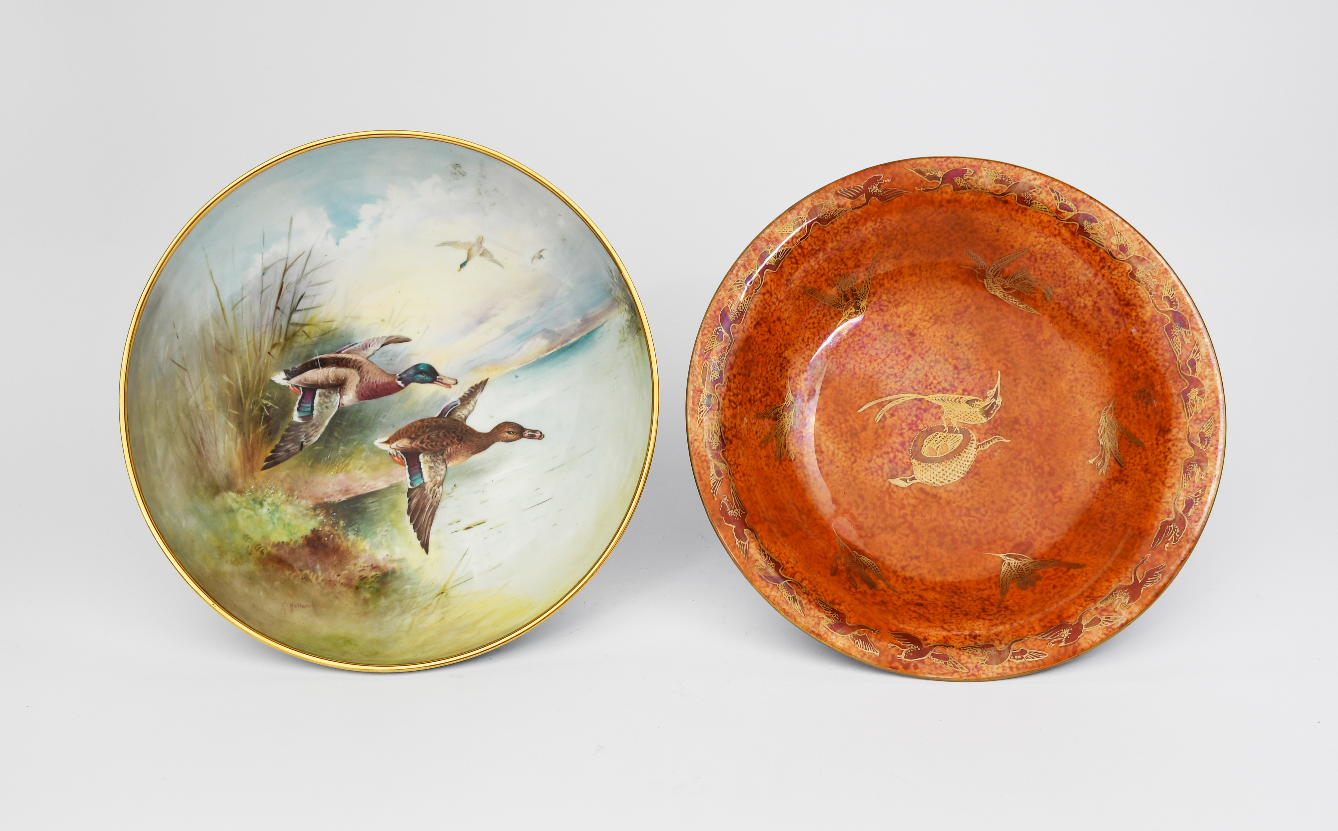 A Wedgwood Humming Bird Lustre bowl designed by Daisy Makeig-Jones, printed in gilt on a mottled orange lustre interior, the exterior blue lustre, and a Mintons bowl by H Holland decorated with mallards flying, printed and painted factory marks, Wedgwood restored, 28cm. high (2)