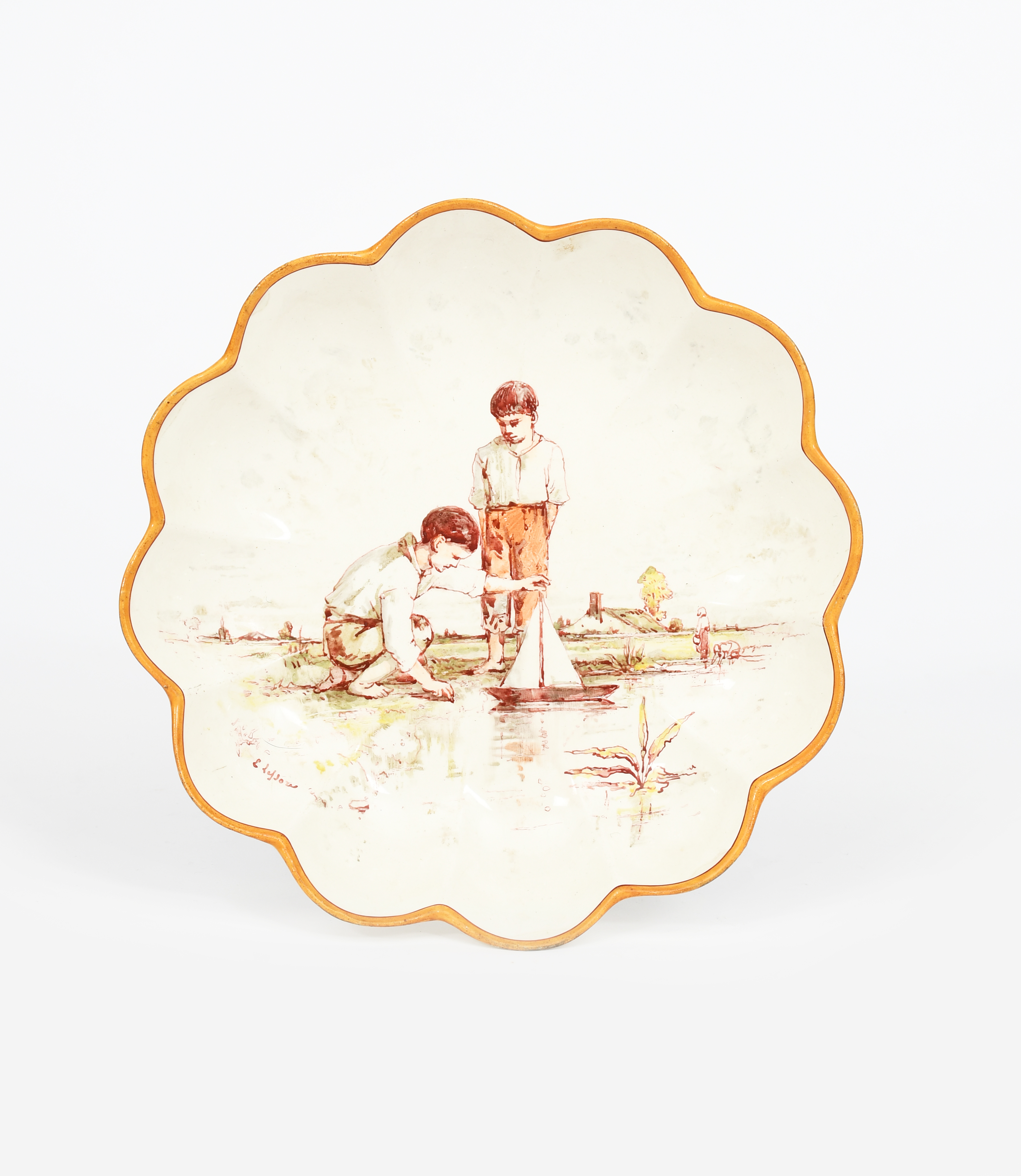 A Wedgwood plate by Emile Lessore, fluted form, the well painted with two boys playing with a pond yacht, in colours impressed factory mark, painted signature to front 23cm. diam.