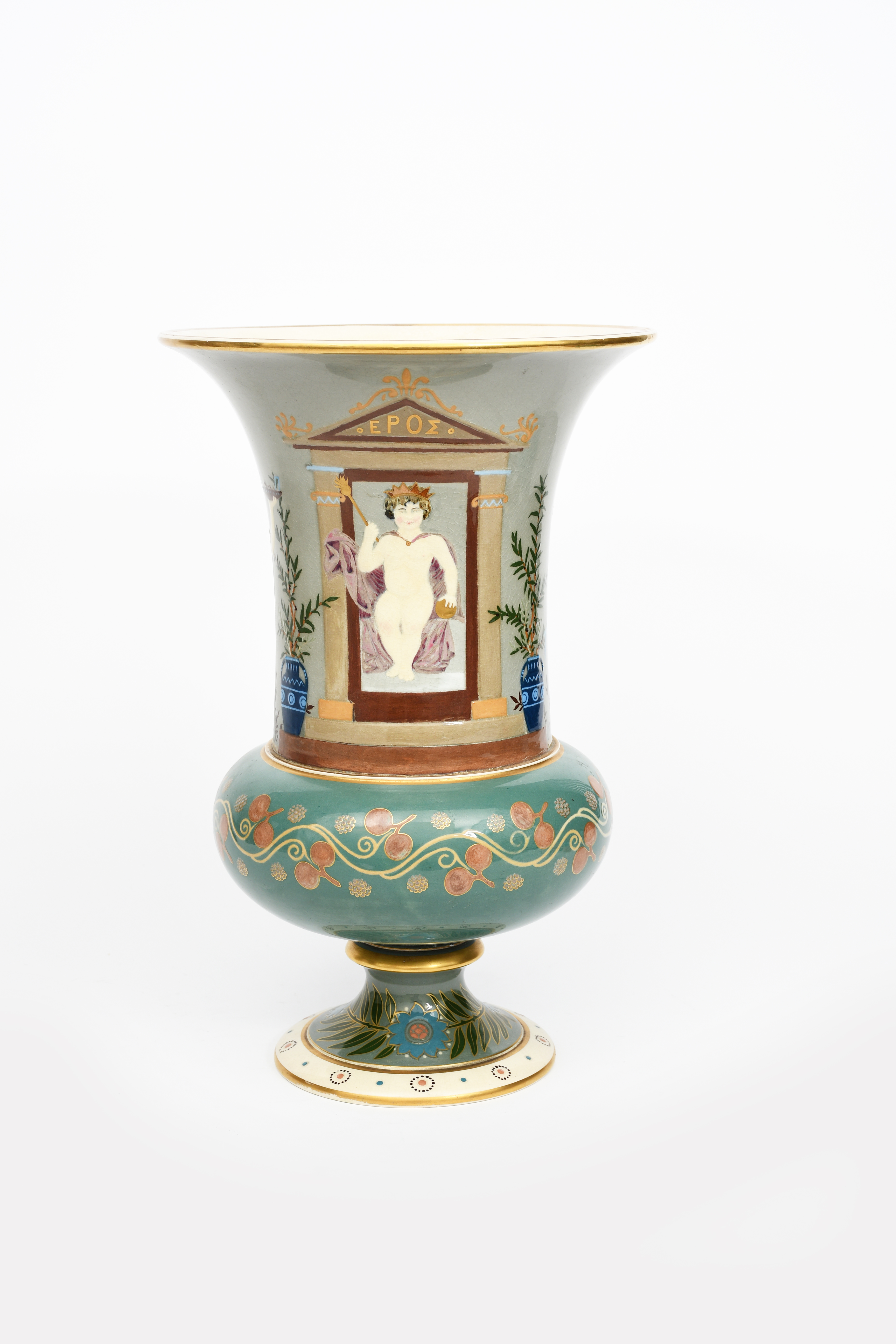 A large urn shaped vase possibly Wedgwood the design attributed to Frederick Alfred Rhead, decorated with Epoe seated on a throne with classical maidens in attendance, in low relief, painted in colours and highlighted in gilt on a pale grey ground, the swollen lower body with a band of scrolling stylised vine and berry, the foot with a laurel border with blue flowerheads, a James Macintyre & Co bowl designed by William Moorcroft and a Ruskin Pottery lustre bowl, apparently unmarked, restored, 44cm. high (3)