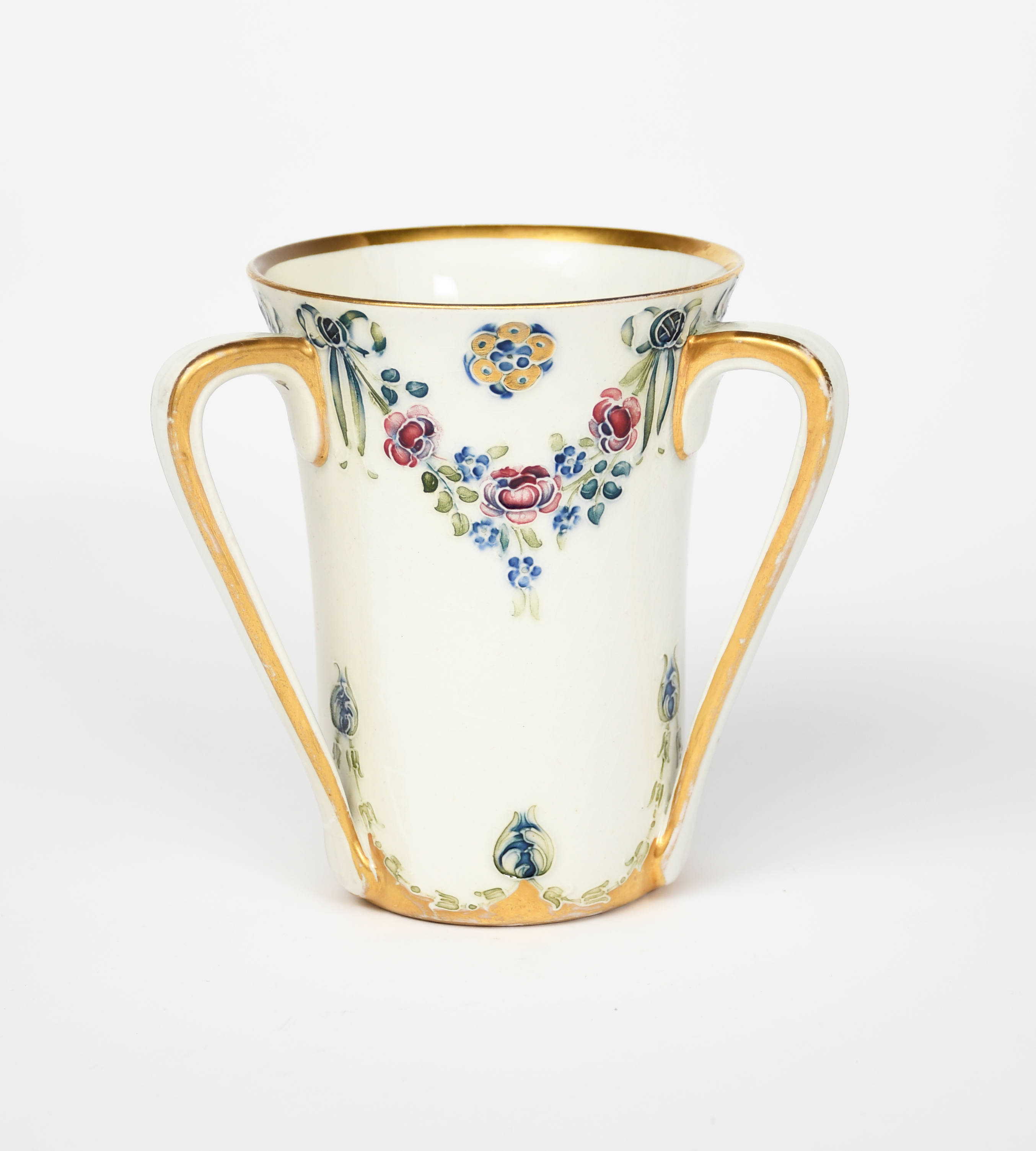 'Aurelian Ware' a James Macintyre & Co vase designed by William Moorcroft, baluster form, printed in gilt with Art Nouveau flower panels on a deep blue ground, 'Eighteenth Century' a James Macintyre & Co tyg designed by William Moorcroft and a small Moorcroft Pottery pot printed factory marks, 21cm. high, (3)