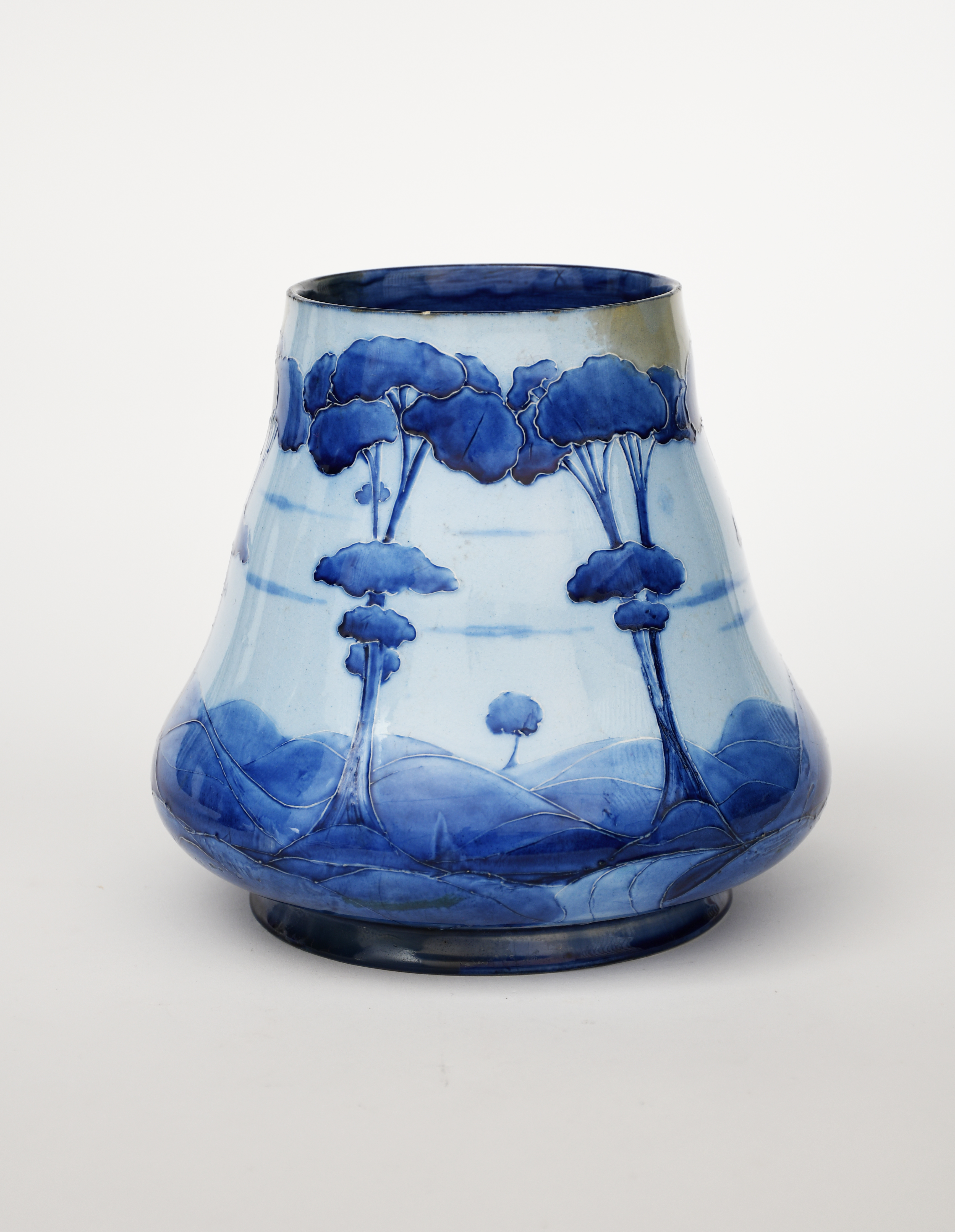 'Landscape' a James Macintyre & Co Florian Ware vase designed by William Moorcroft, tubeline decorated with tall tress in a landscape, painted in blue on a pale blue ground, printed factory mark, painted green signature, old restoration, 18.5cm. high