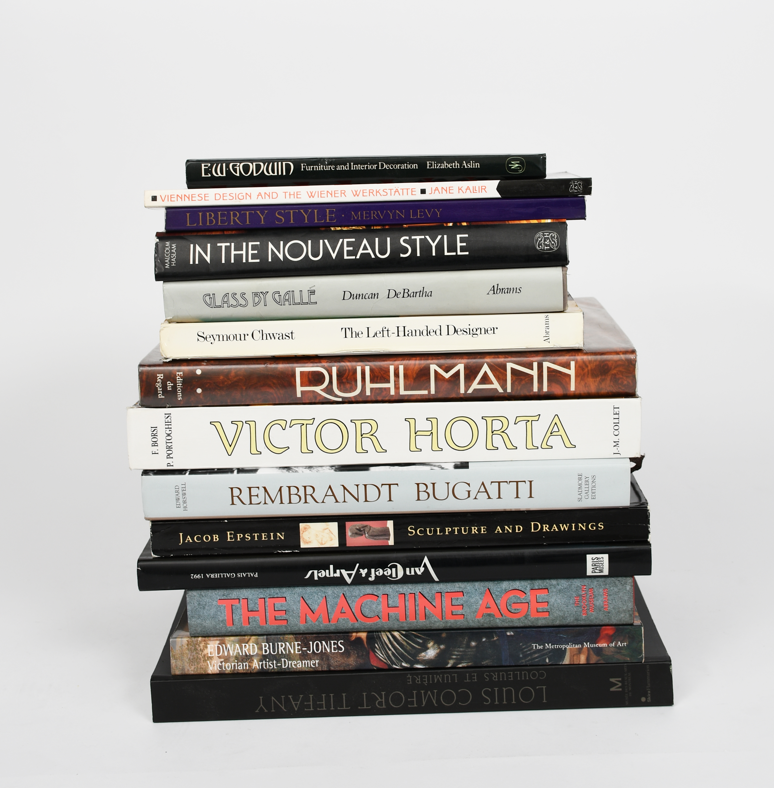 A large library of art and design reference books and catalogues, approximately 90 books including; Alastair Duncan Art Deco Complete, Edward Horswell, Rembrandt Bugatti - Life in Sculpture, Sladmore Gallery, Jacob Epstein Sculpture and Drawings, Whitechapel Art Gallery, Van Cleef & Arpels, Edition Paris-Musees, The Machine Age in America 1918-1941, F Borsi Victor Horta, Elizabeth Aslin EW Godwin, Jane Kallir Viennese Design and the Wiener Werkstatte, Ruhlmann, George Nakashima, Mervyn Levy Liberty Style, Malcolm Haslam In the Nouveau Style, Alistair Duncan Glass by Galle, Seymour Chwast The Left-Handed Designer, Edward Burne-Jones Victorian Artist and Dreamer and Louis Comfort Tiffany Couleurs et Lumiere, and seventy-six auction catalogues from Christies, Sotheby's, and Quittenbaum,