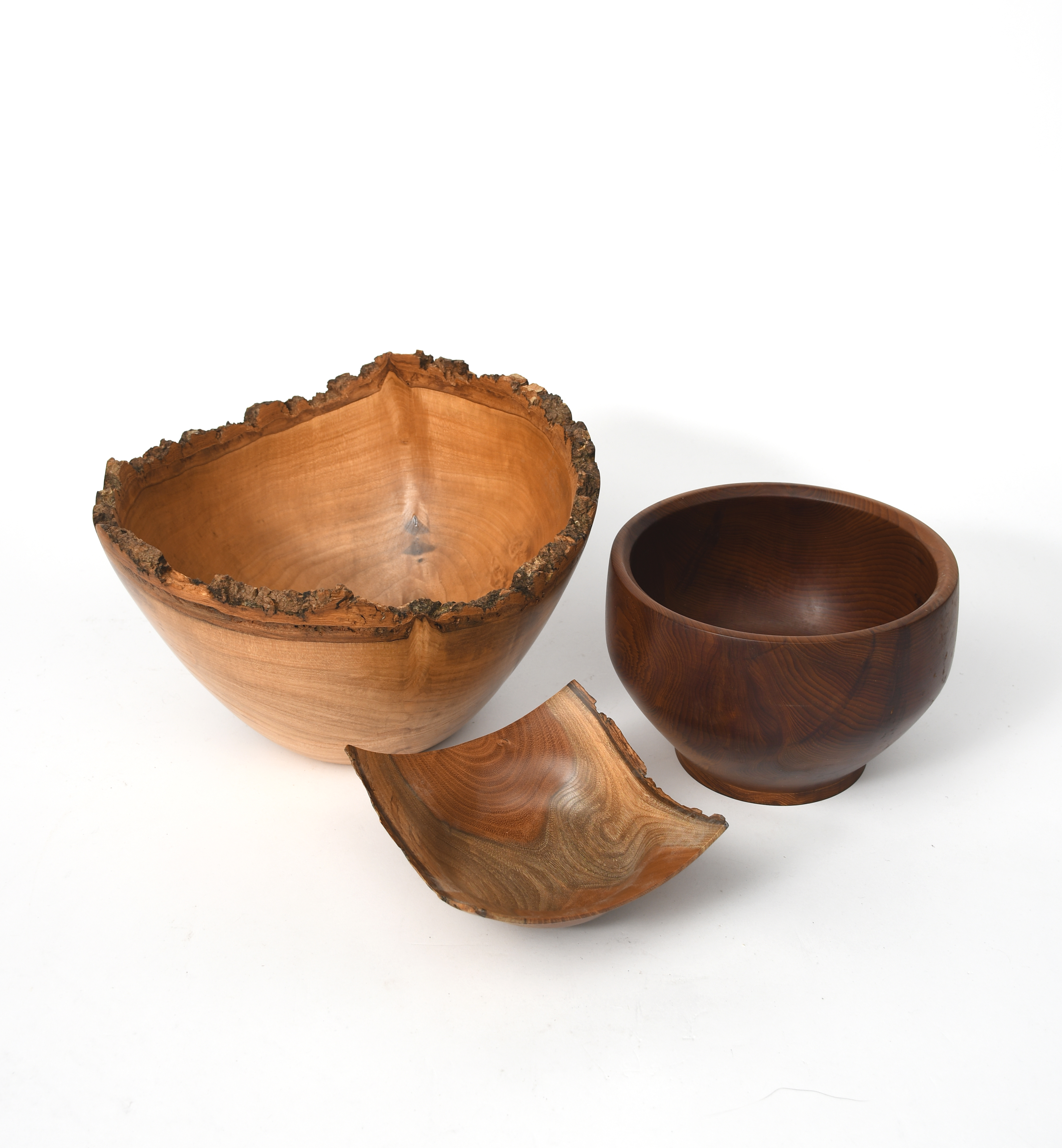 a wood bowl, circular with graduated carved band to rim, two graduated bowls by Cecil Colyer, two others by Cecil Colyer, a small Broom tree bowl by Peter Thomas, a deep sycamore bowl by Paul Boak, a bowl with inverted rim by Dave the Lathe a stained wood vase and cover and two rectangular section bowls,