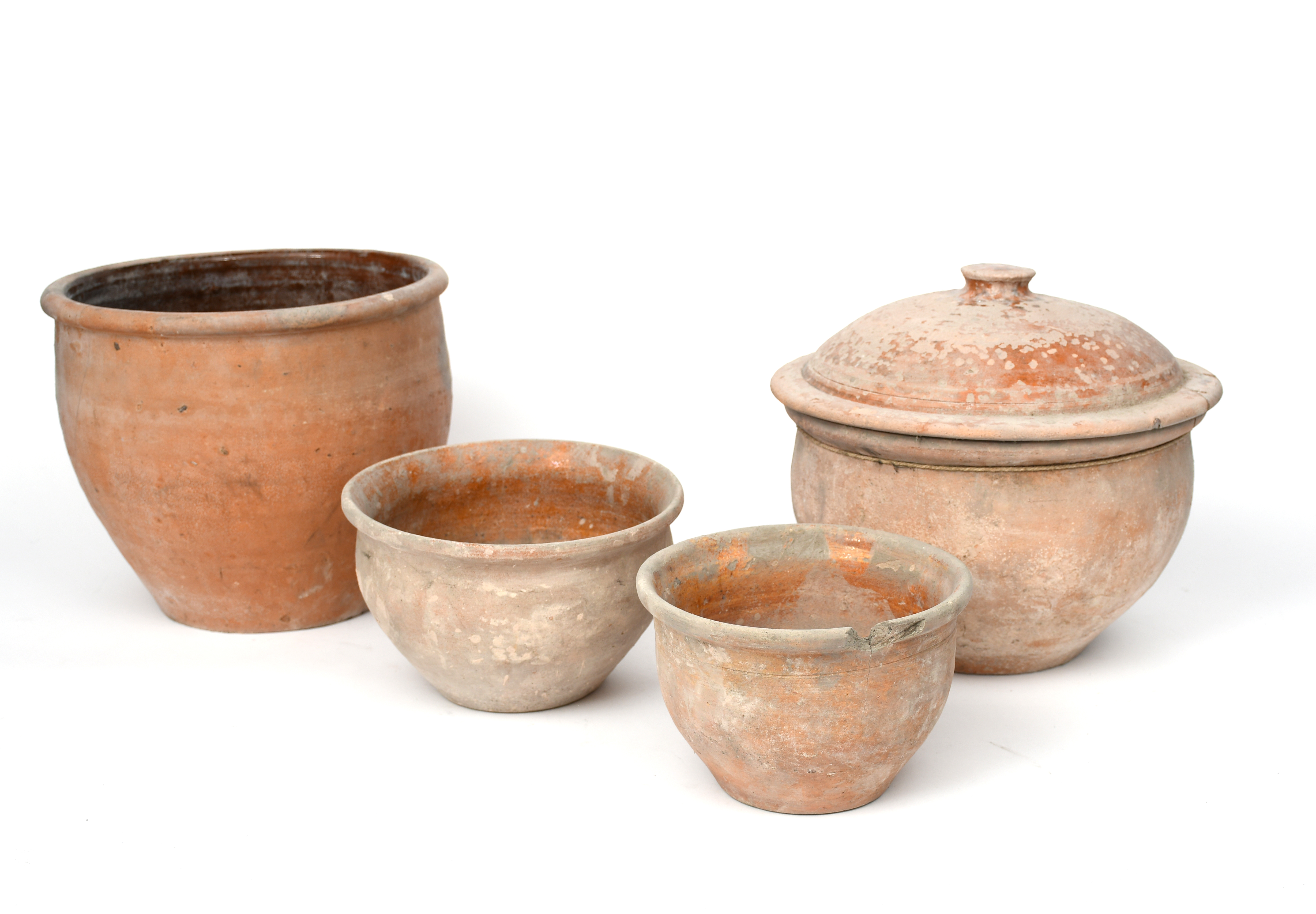 Four large graduated pots, glazed to the interior, two smaller pots, a pot and cover, a lid and two other pots,