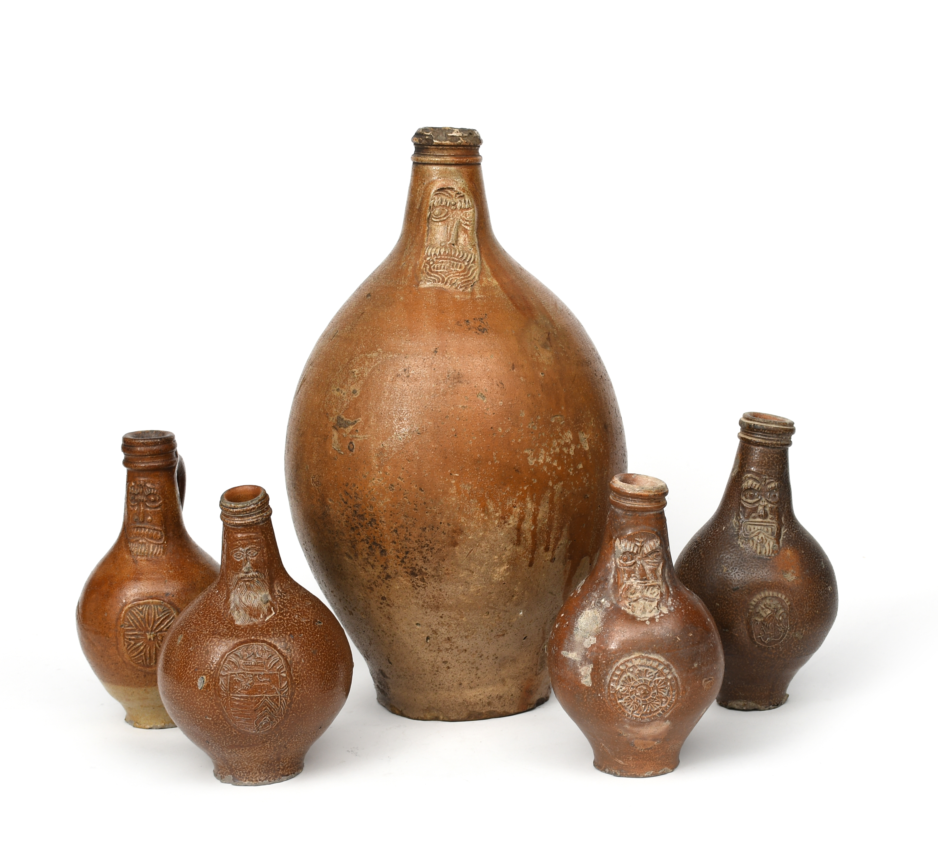 A tall salt-glaze stoneware Bellarmine jar, swollen form, the narrow neck incised with bearded face, and four others smaller,