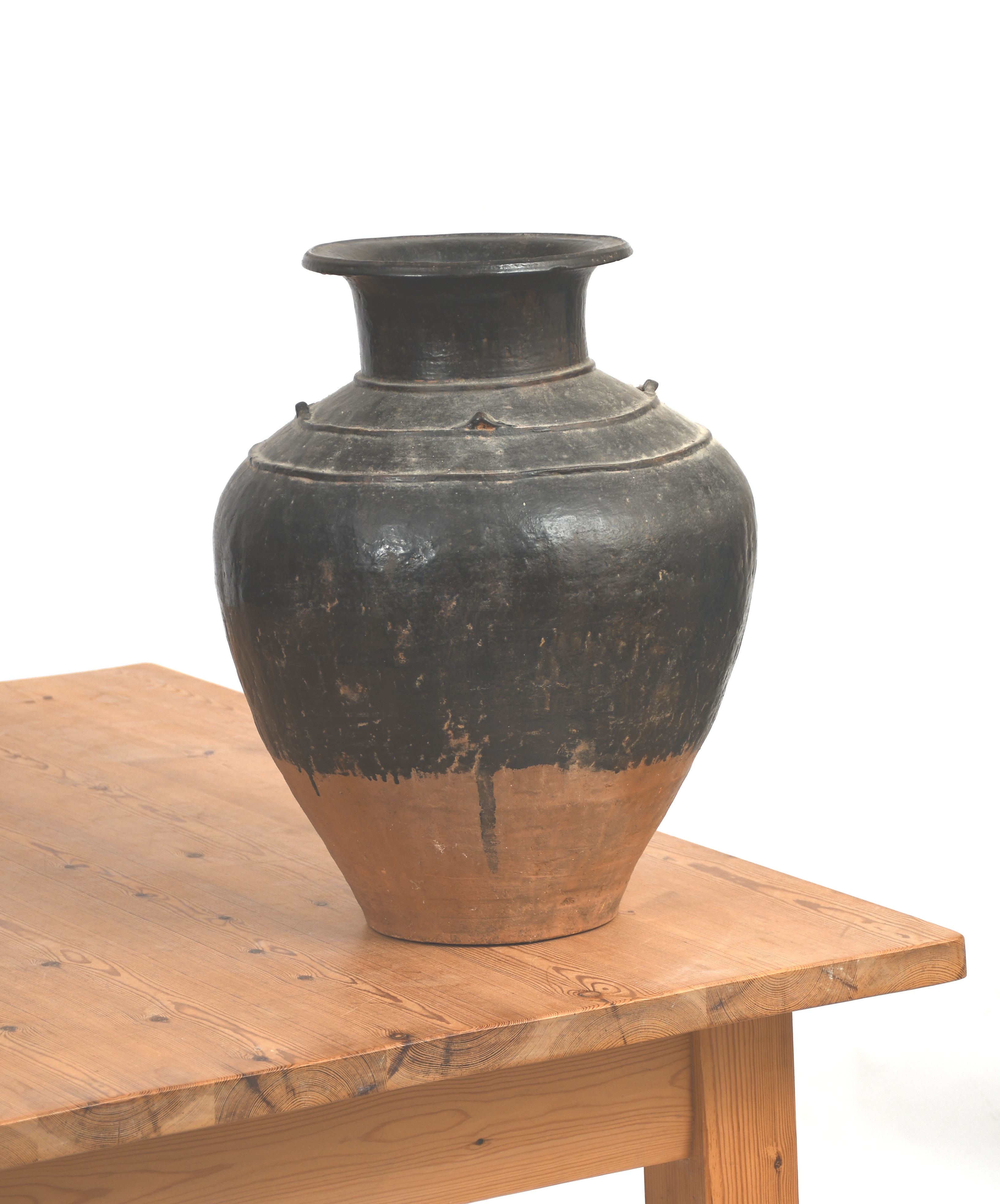 A large south-east Asian baluster vase, shouldered form with four applied loop handles and raised bands, glazed from neck to lower body with dark brown glaze,