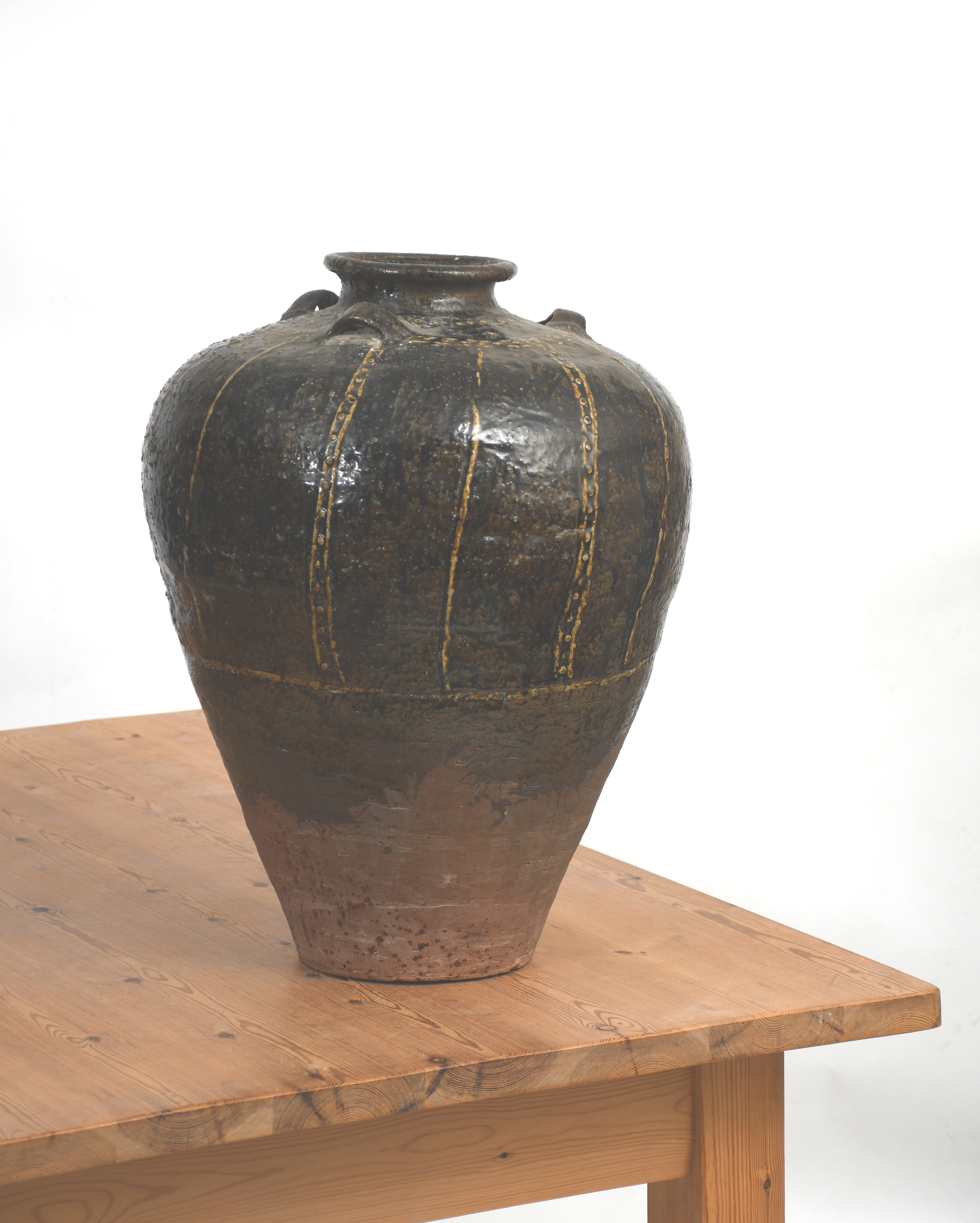 A large south-east Asian shouldered vase with collar rim, shouldered form with three applied loop handles, glaze from the neck to the upper body in dark brown, with slip decoraton