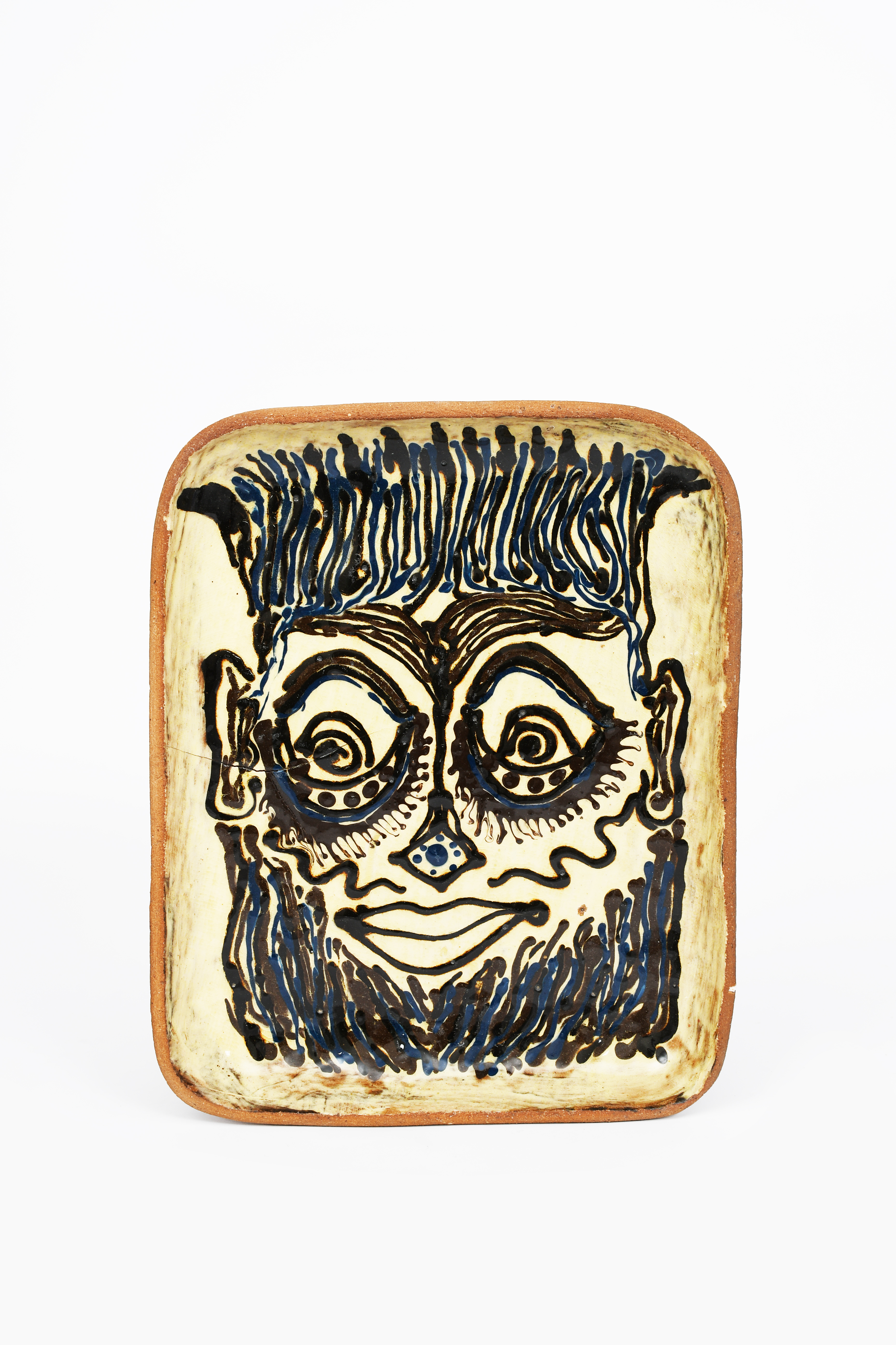 an early Bryanston School slip decorated dish, decorated with a bearded figure, in brown and blue slip on a cream ground,