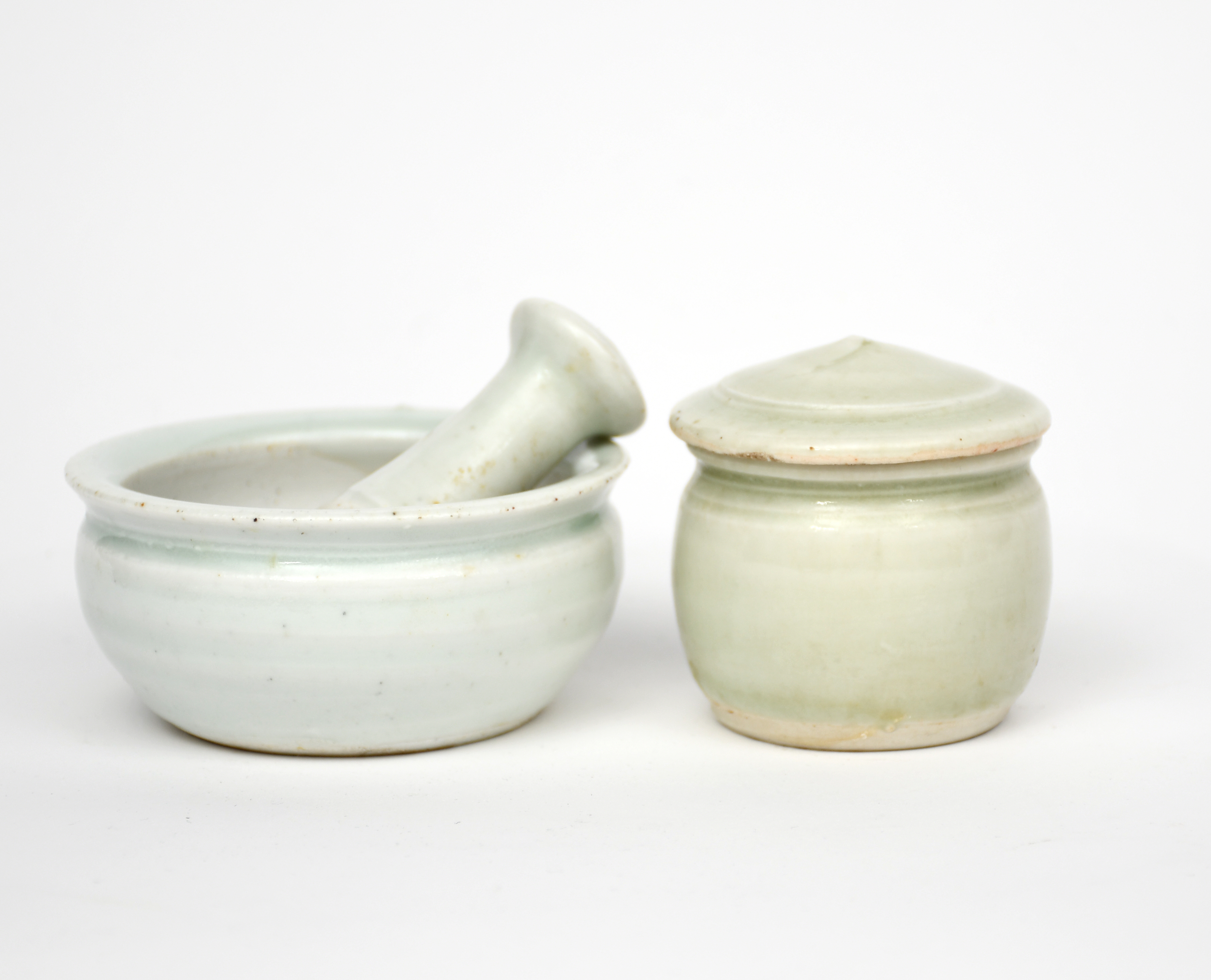 a small porcelain box and cover, covered in a oak ash glaze, and a porcelain pestle and mortar,