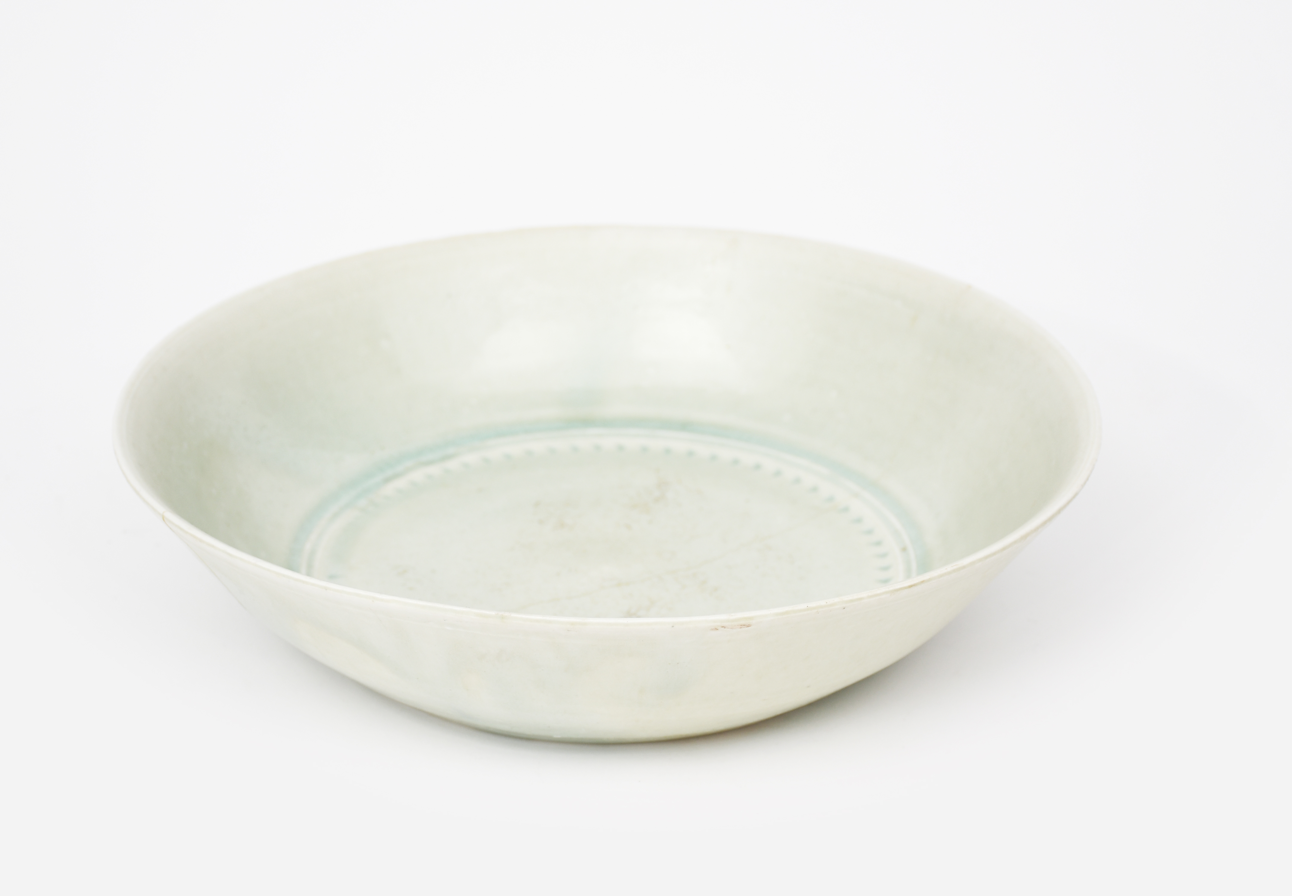 a porcelain bowl with chattering band, covered in a pale oak ash glaze