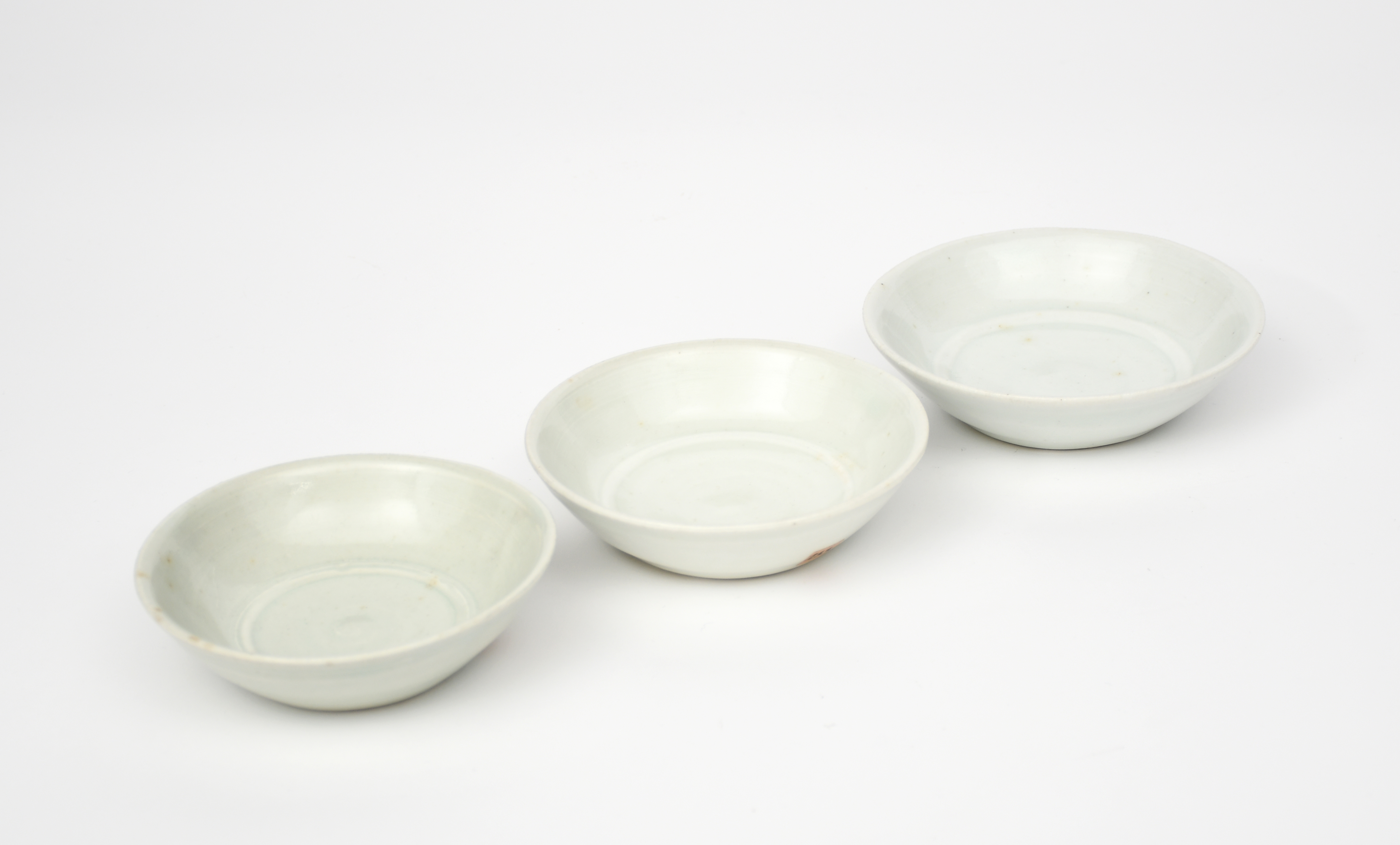 a set of three porcelain avocado dishes, covered in a pale blue oak ash glaze