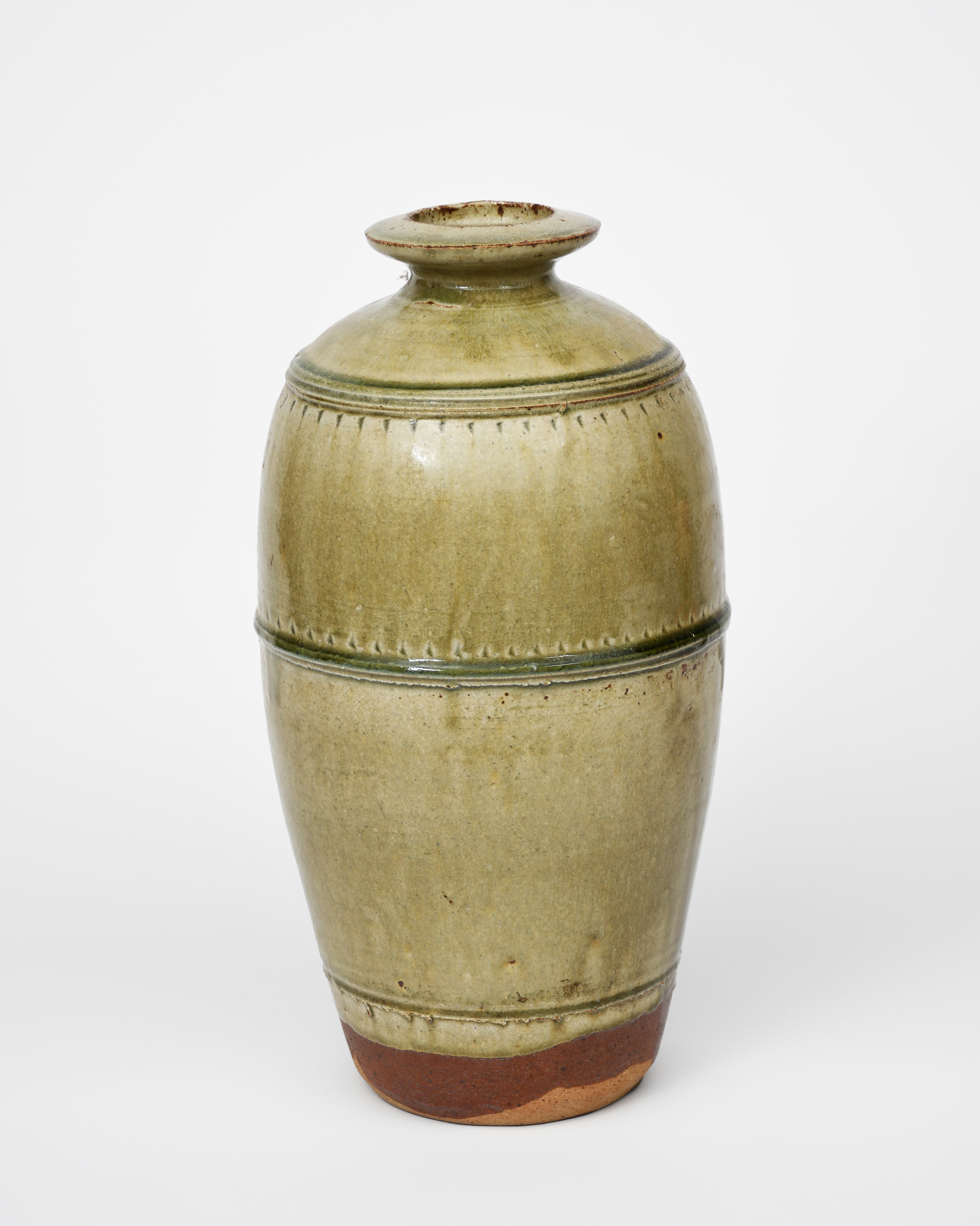 a stoneware bottle, with chatter and raised bands, covered to the foot with an ash glaze