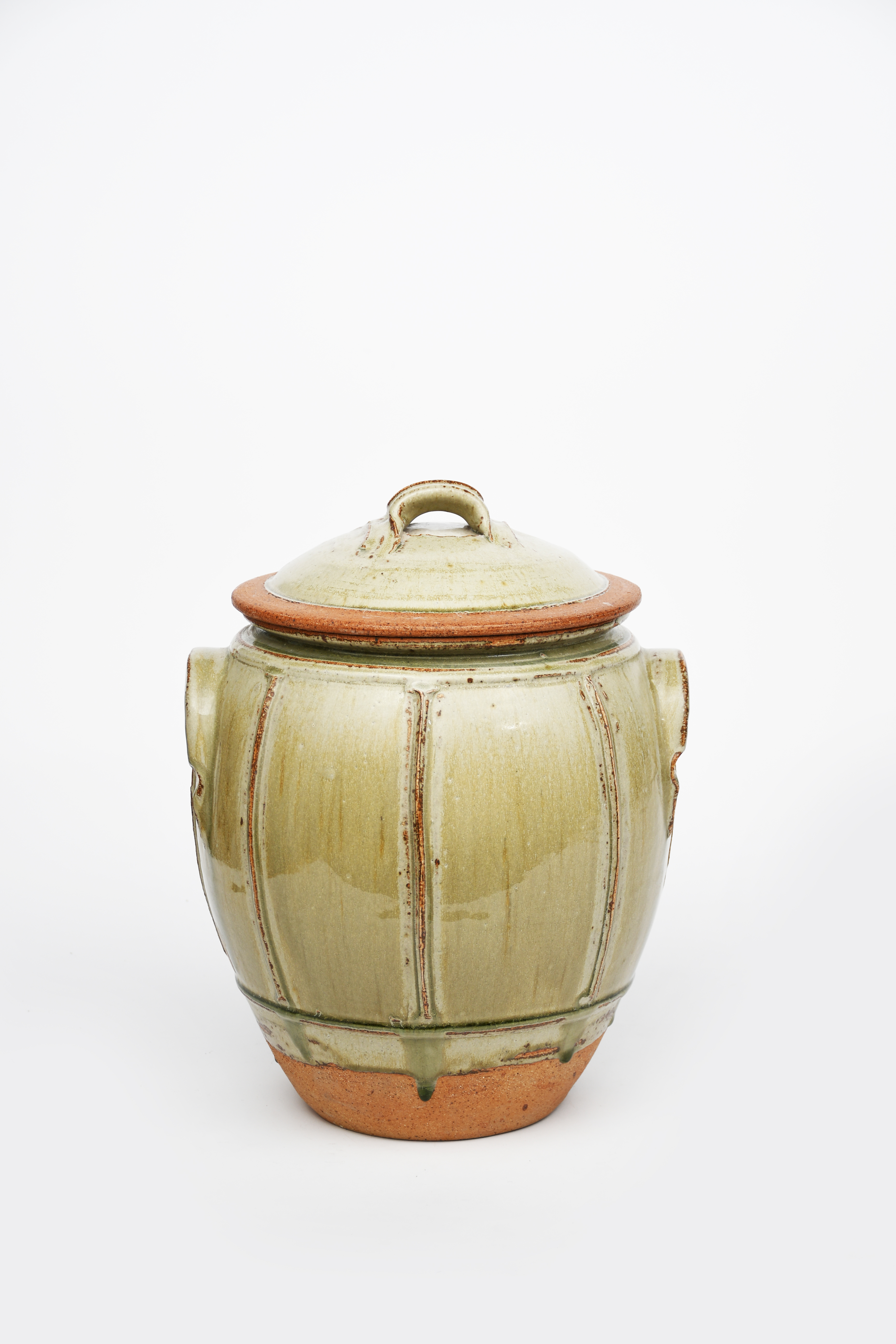 a stoneware beer jar and cover, twin-handled form with raised ribs, glazed to the foot in ash,