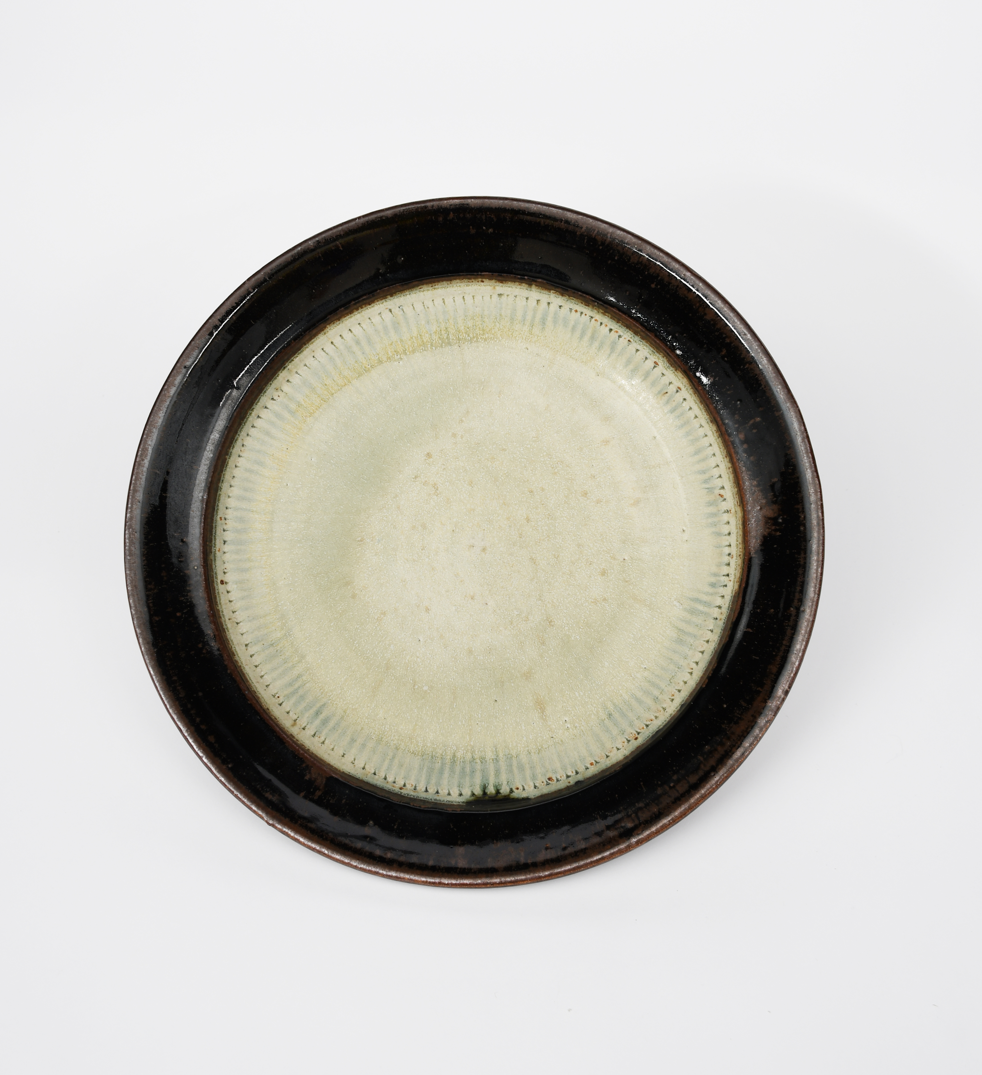 a large stoneware fruit dish, ash glaze, with white slip, the rim black iron,
