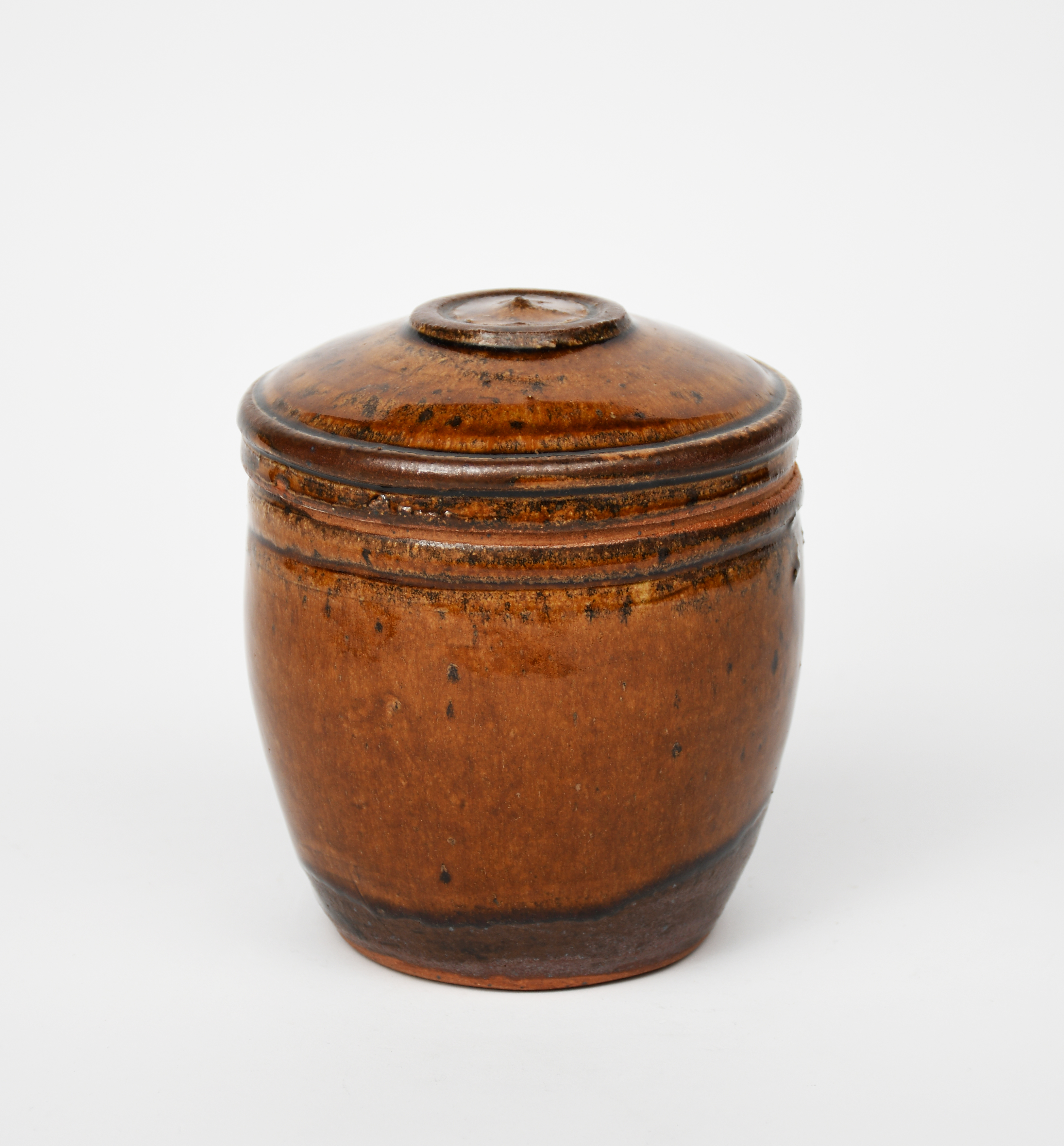 a stoneware medium caddy and cover, covered in a manganese glaze, the interior ash,