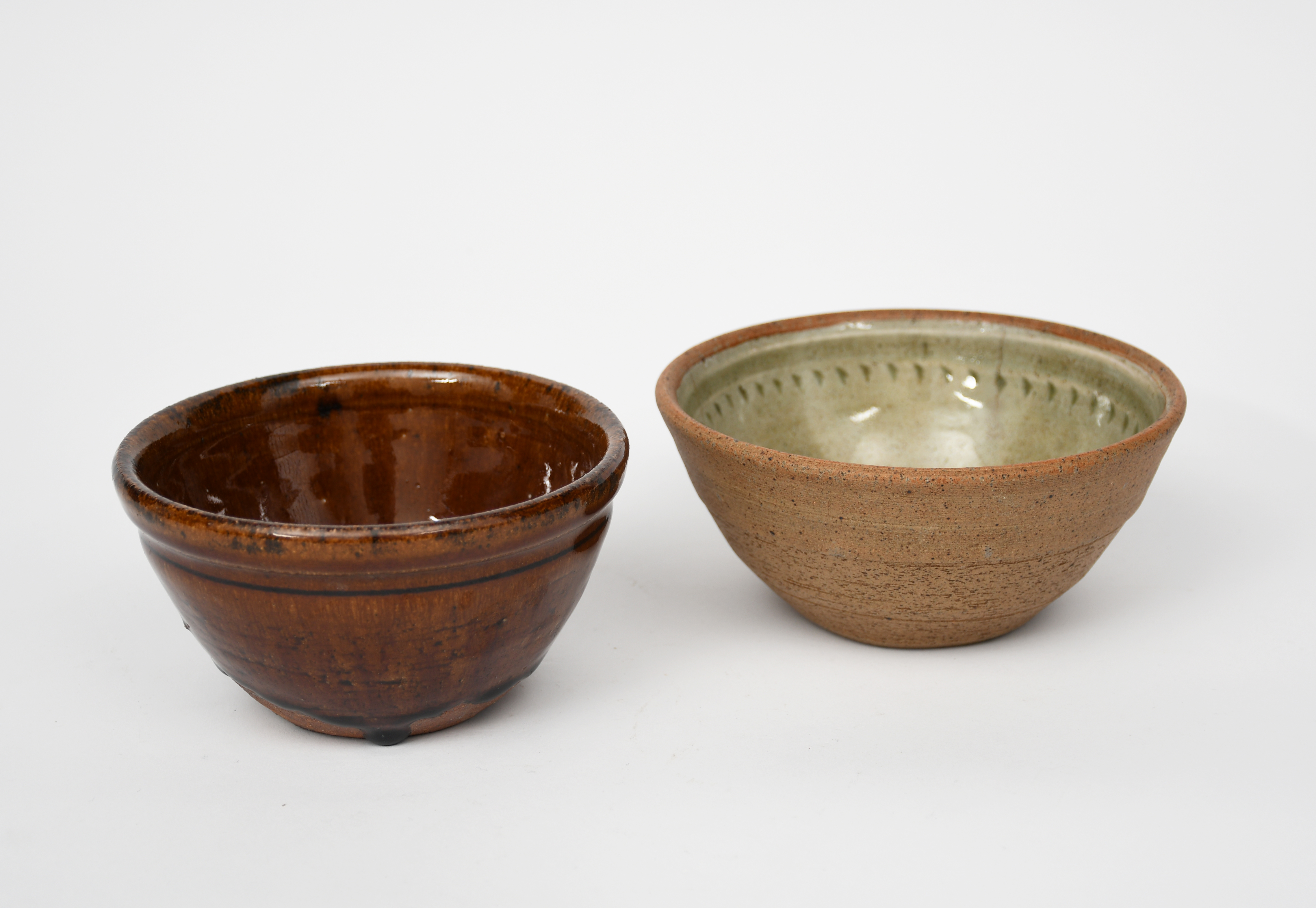 a small pudding basin, covered in a manganese glaze, and a stoneware bowl with chatter band