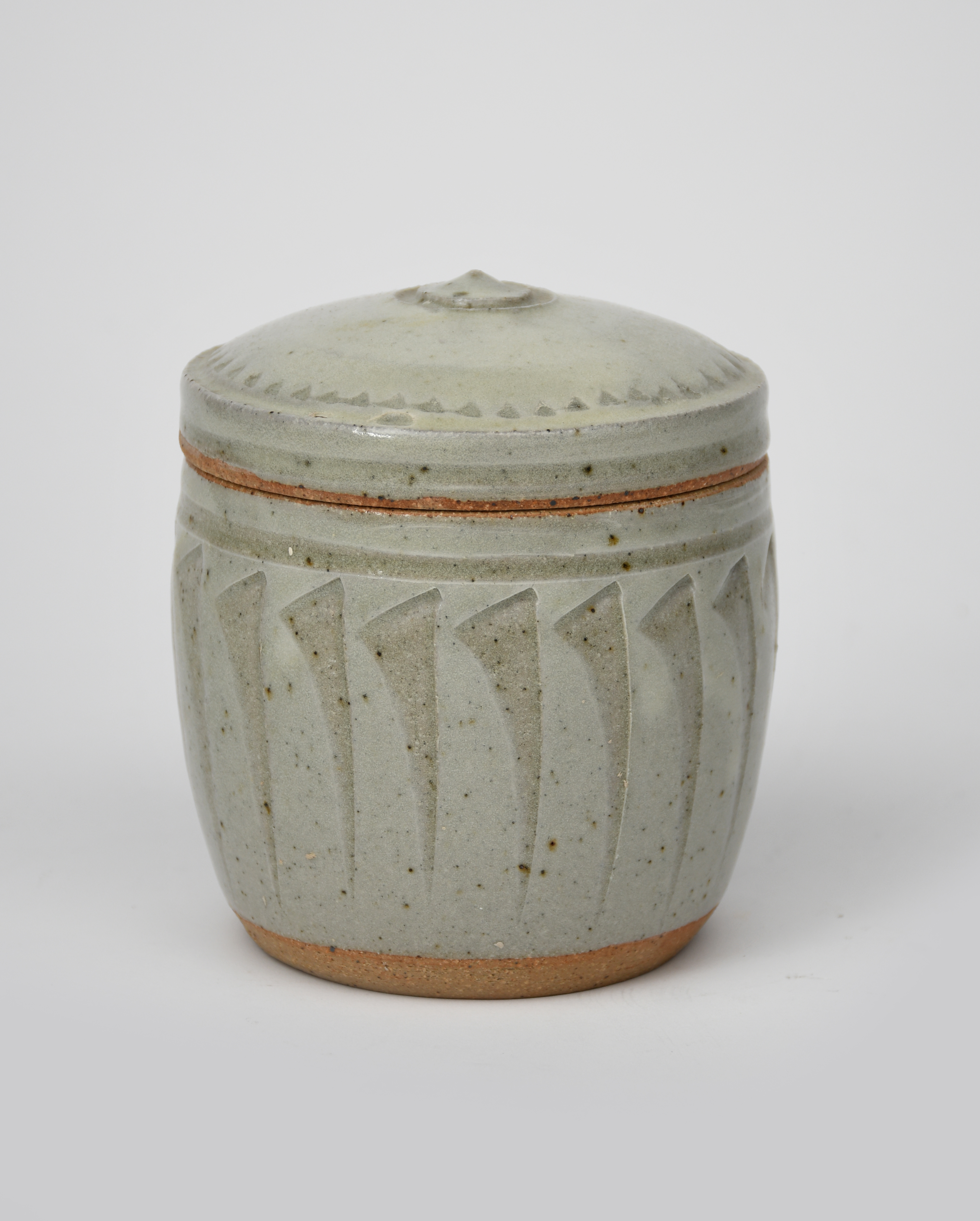 a cut-sided stoneware white-slipped tea caddy and cover, the cover with chatter band, covered in a pale ash glaze,