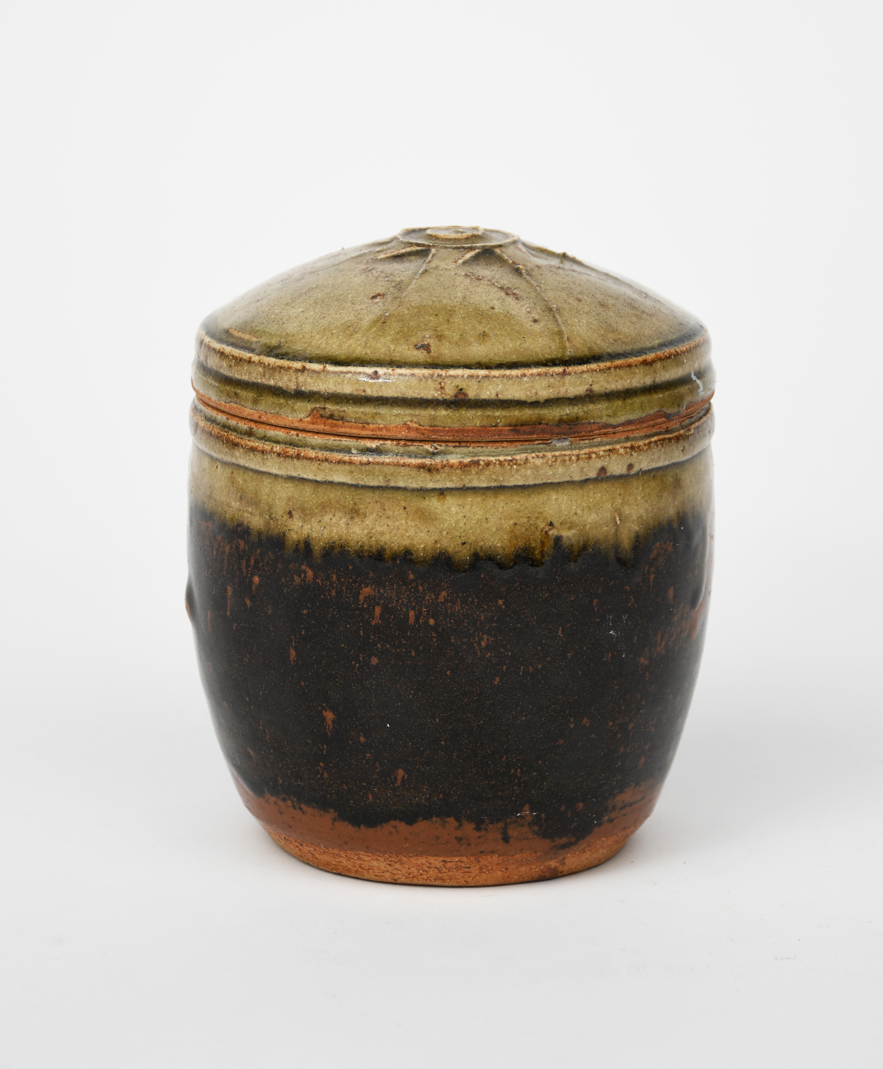 a stoneware caddy and cover, the cover and shoulder glazed in ash over dark iron,