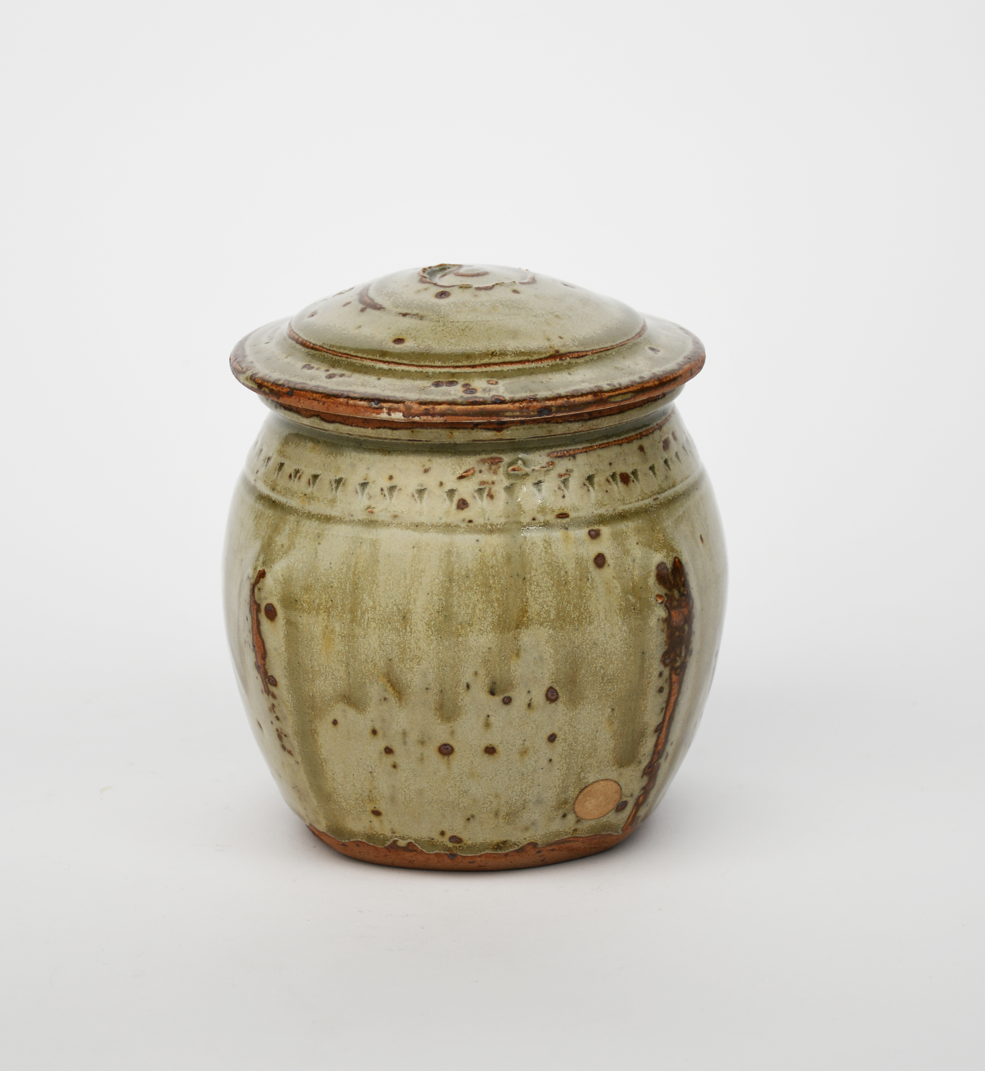 a stoneware beaten jar and cover, with chatter band to shoulder, covered with an ash glaze,
