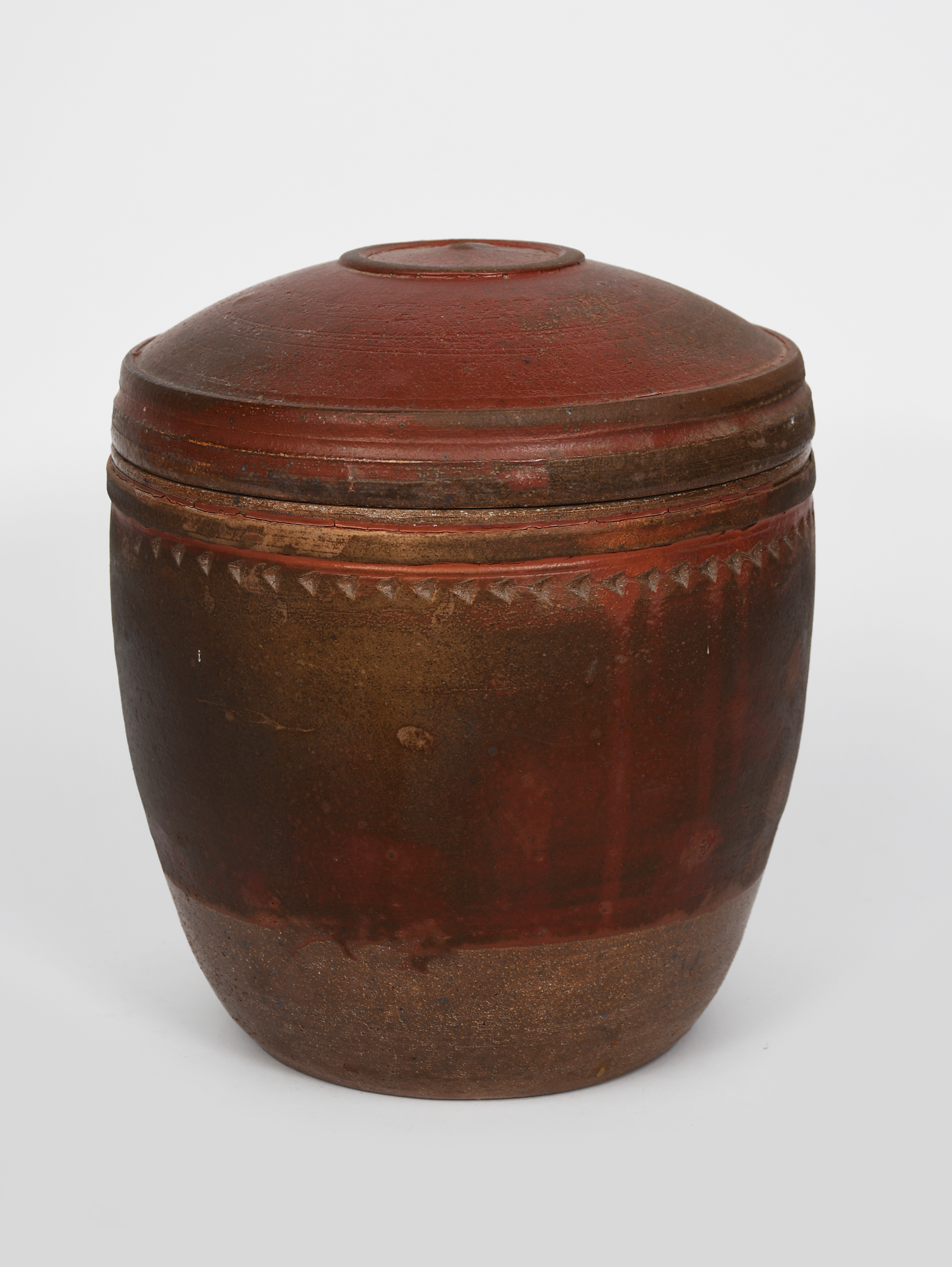 a large salt-glaze stoneware caddy and cover, with chatter band, the interior glazed ash