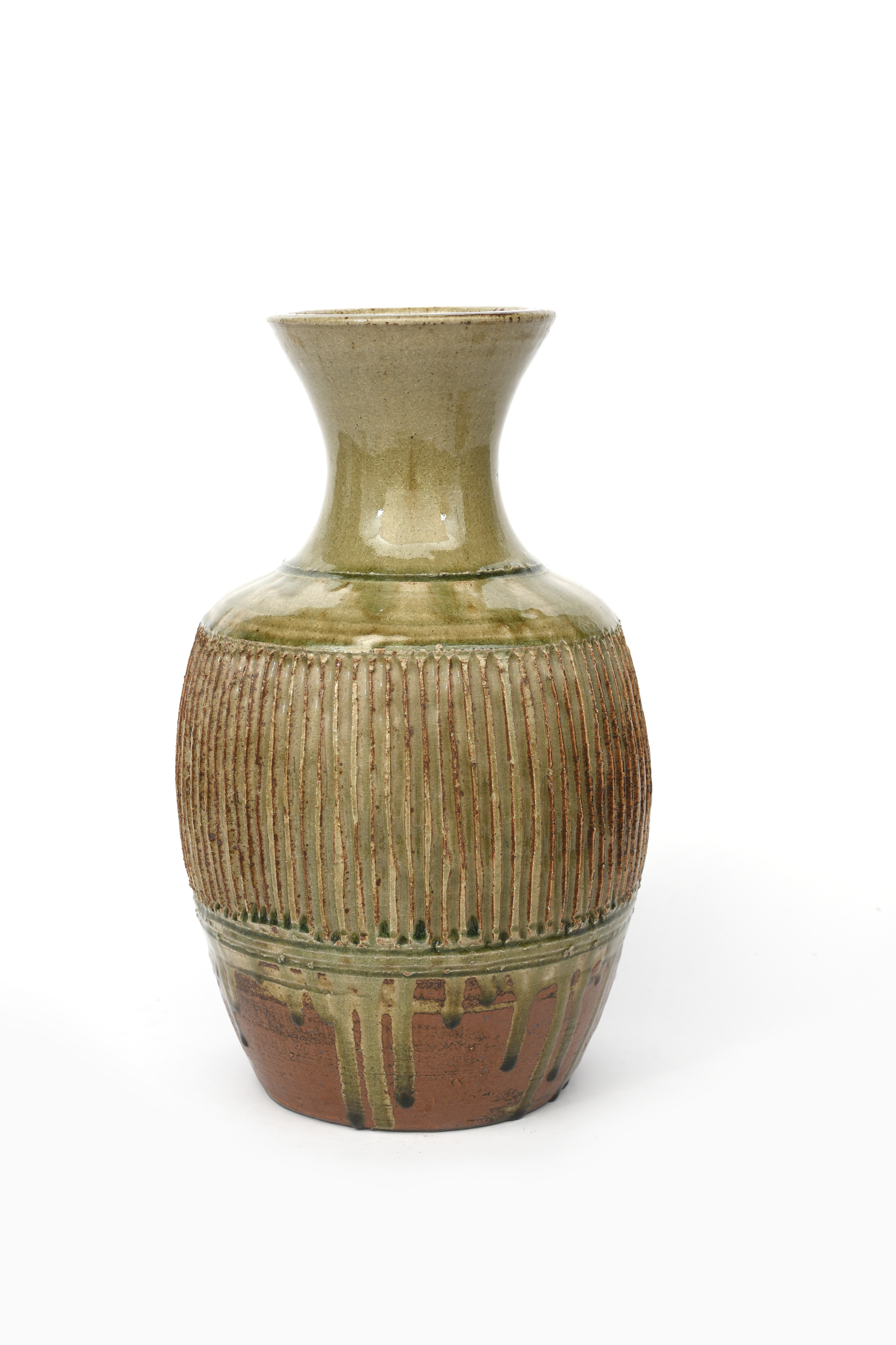 a large, early stoneware vase, shouldered form with cut band, covered to the base in an ash glaze