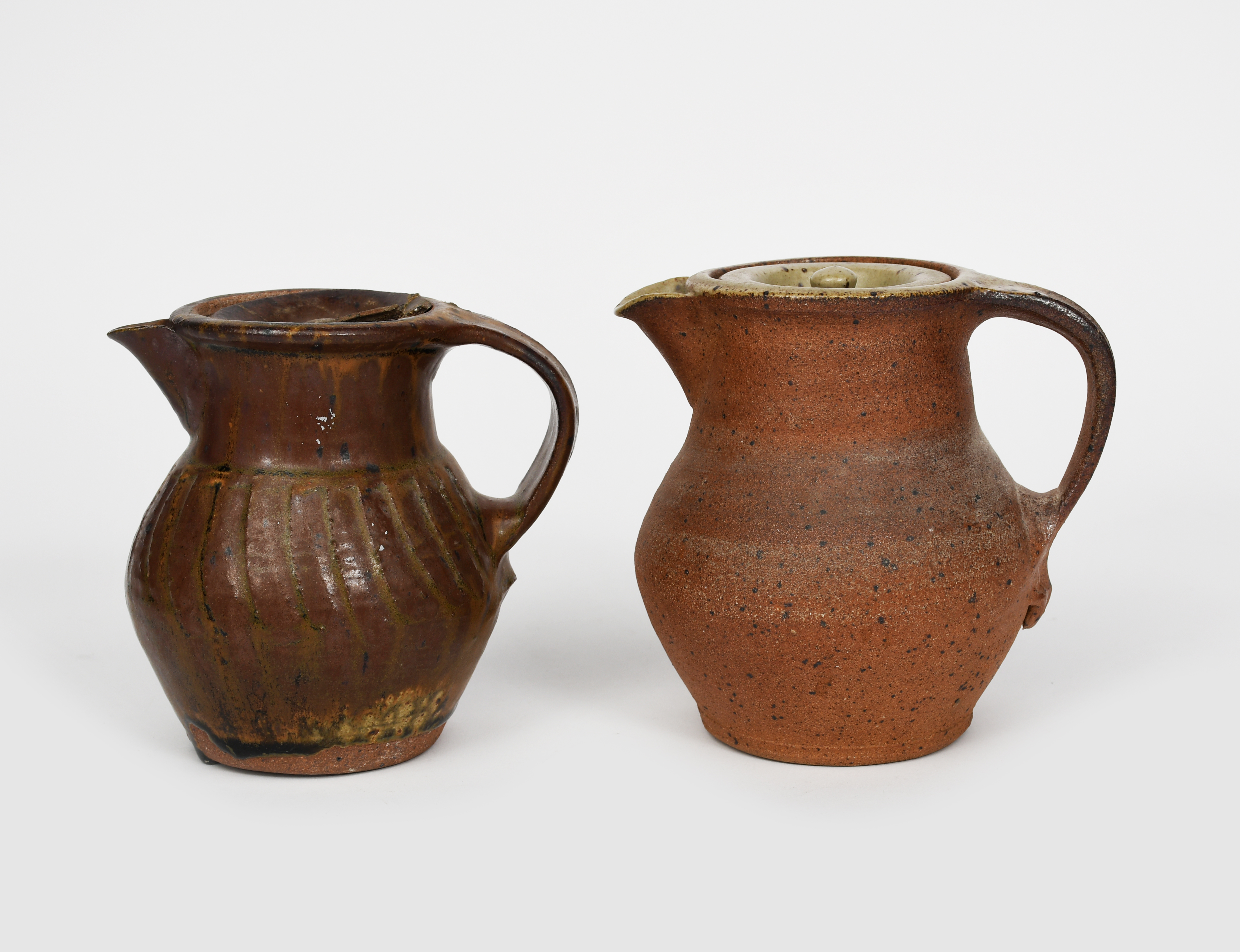 A Leach Pottery stoneware coffee pot and cover, glazed to the top rim and cover in ash, and another with incised decorations glazed in tenmoku,