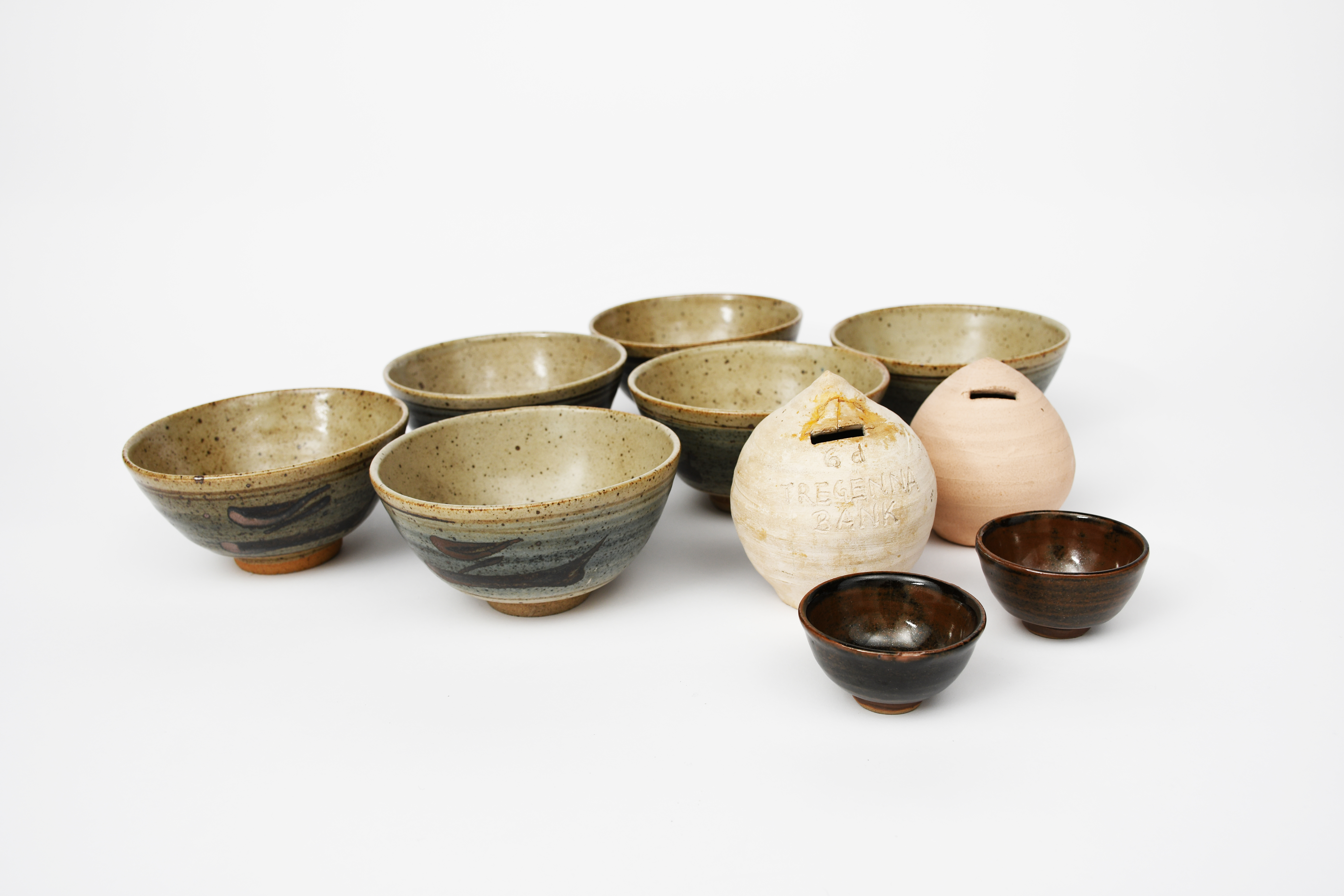 a set of six stoneware bowls, each glazed ash, with brushed tenmoku design over translucent cobalt band, two miniature bowls glazed tenmoku and two unglazed piggy-bands, one titled Tregenna Bank,