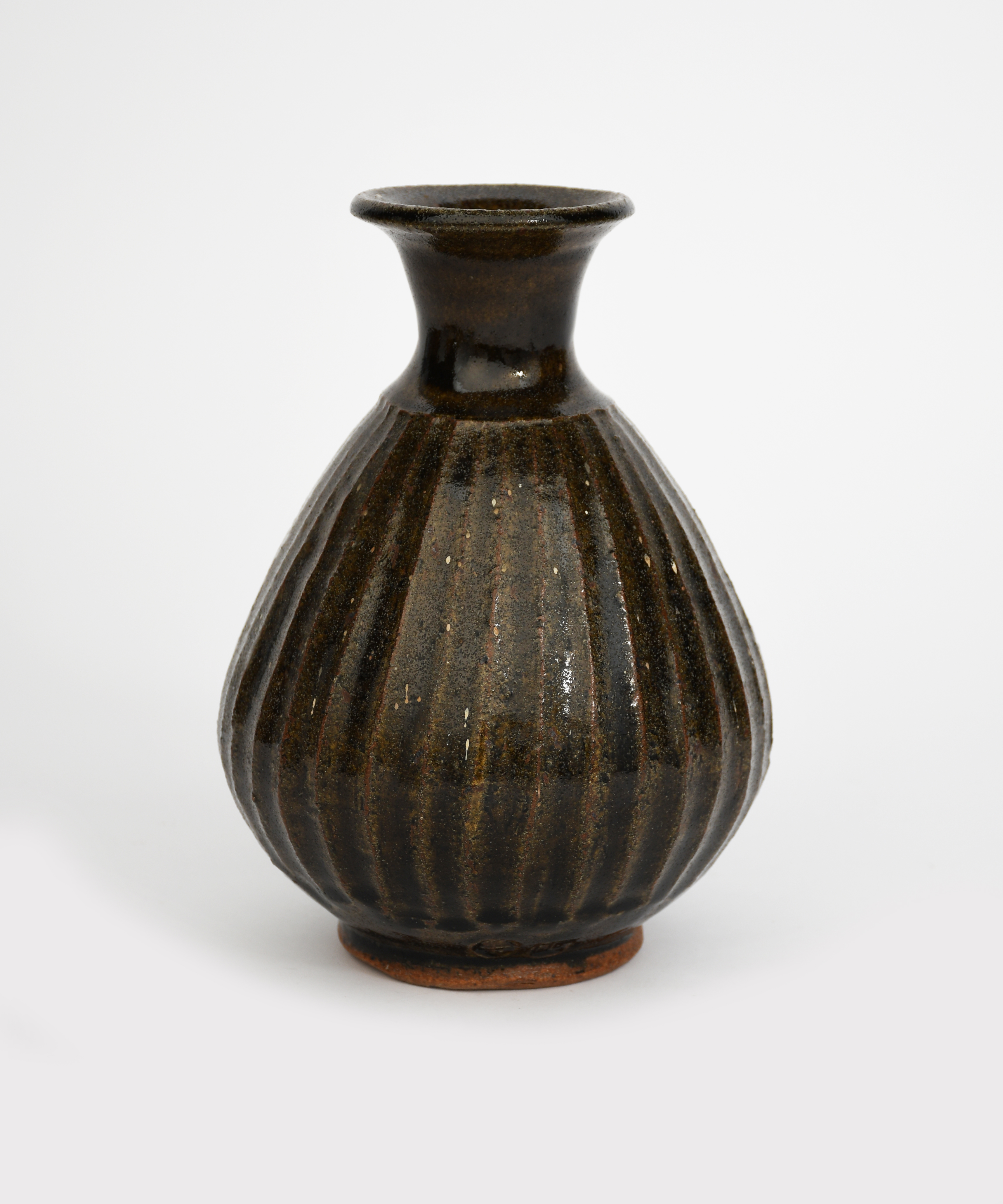 a stoneware bottle, 1958, the fluted tapering body with flaring cylindrical neck, covered to the foot with a tenmoku glaze,