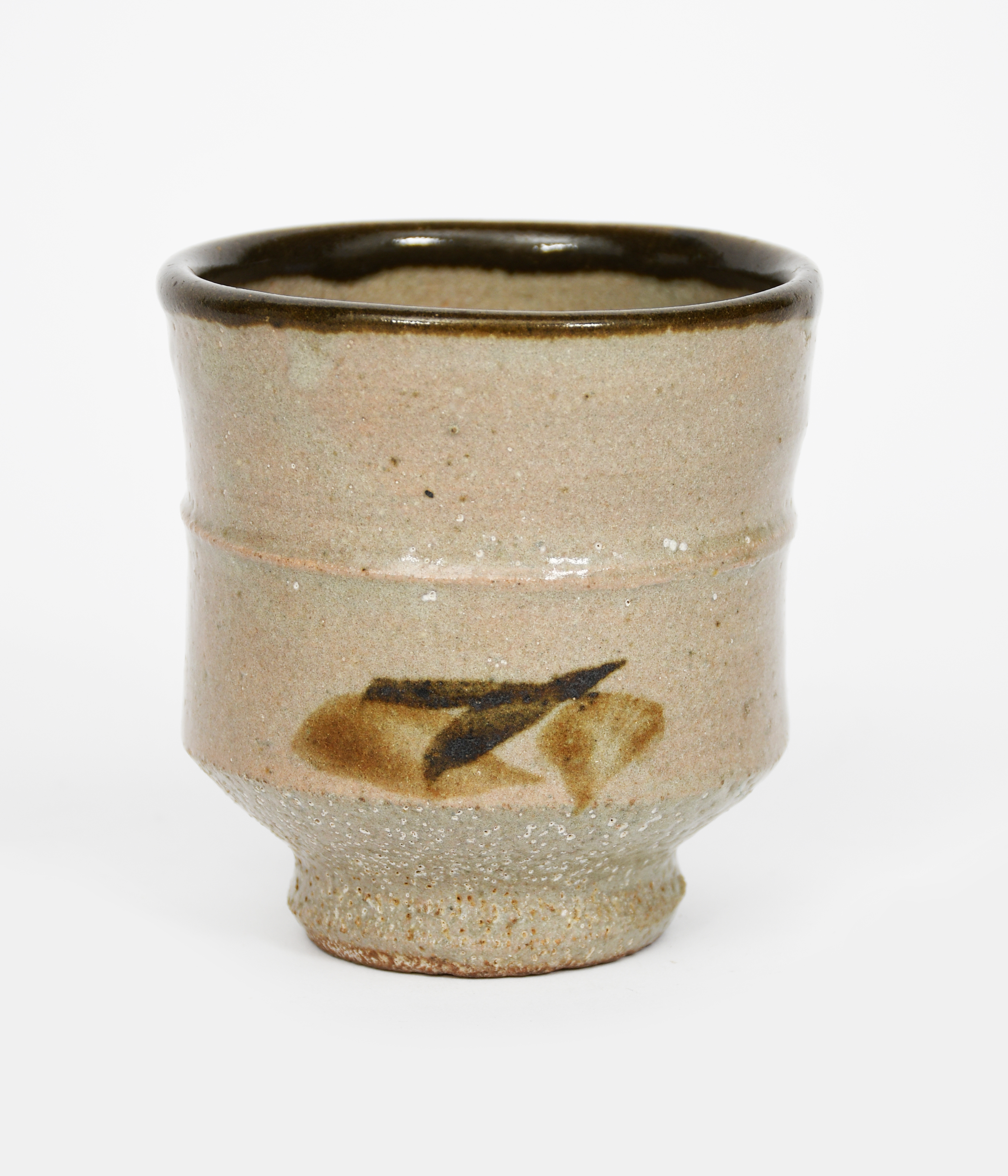 a stoneware unomi, footed cylindrical form, simple brushed design and rim band on an ash glaze