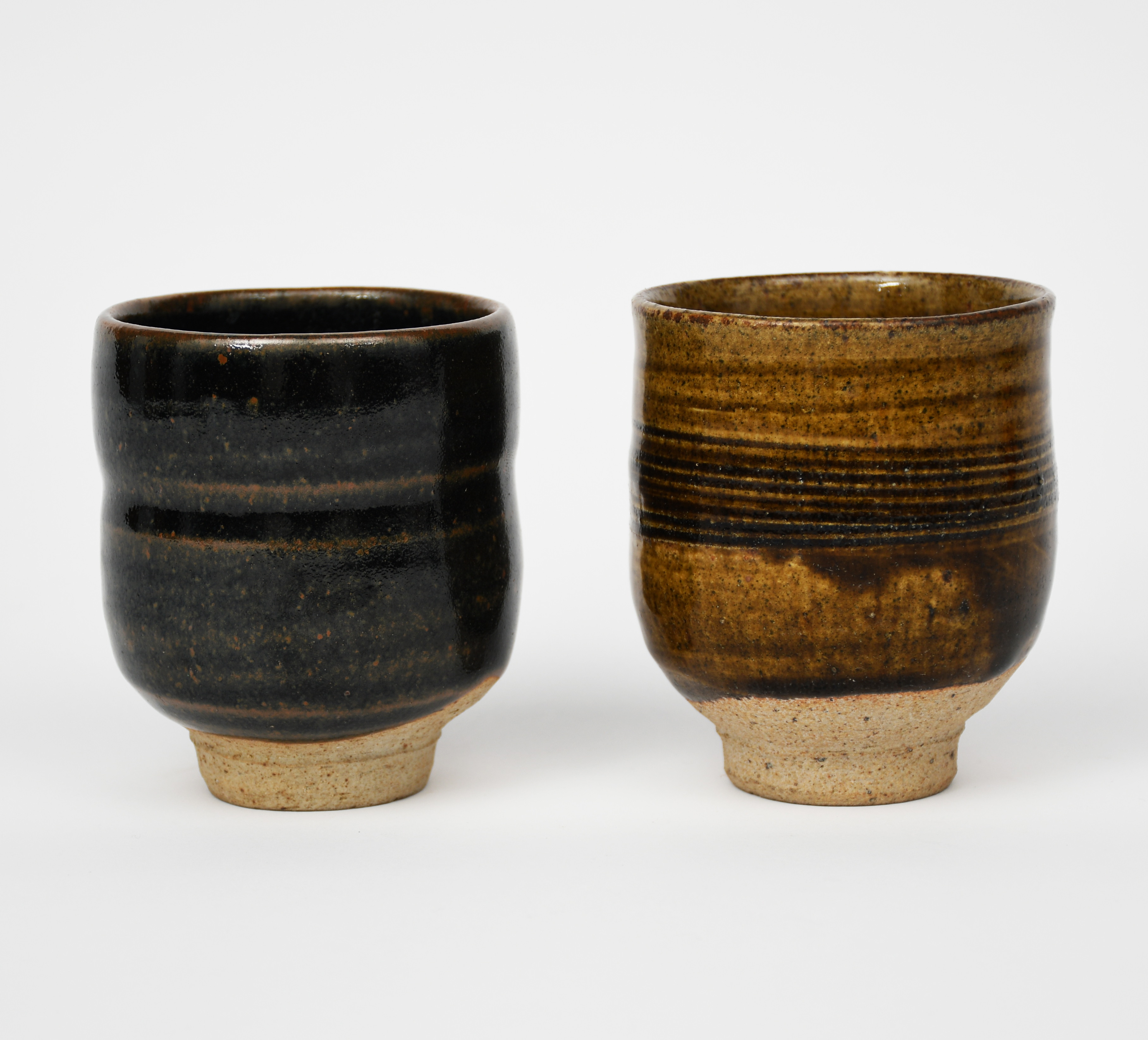 a stoneware unomi, footed form, covered to the foot with a tenmoku glaze and another similar,