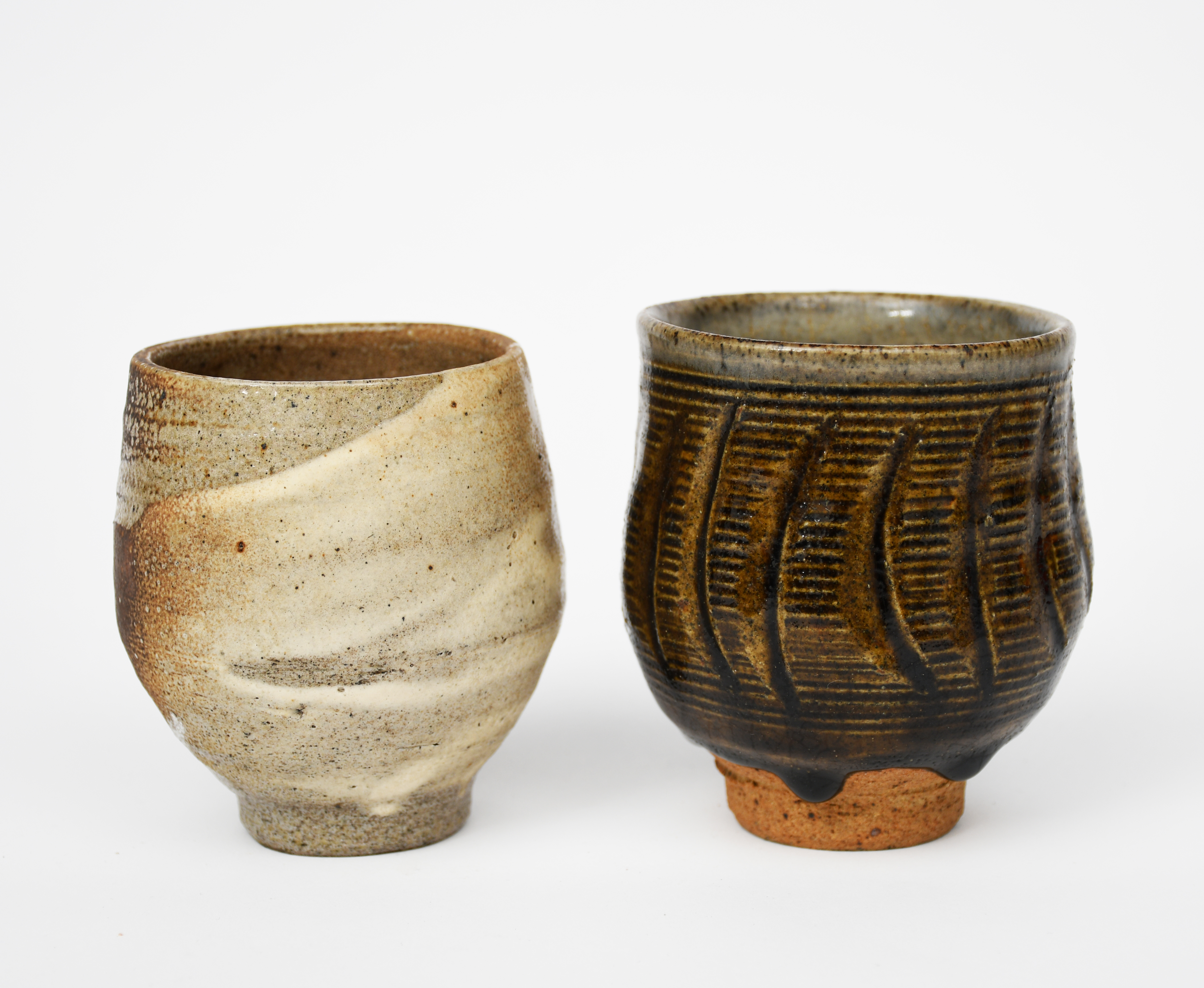 a salt-glaze stoneware unomi, 1957/58, with brushed white slip, and another with incised decoration under an ash glaze,